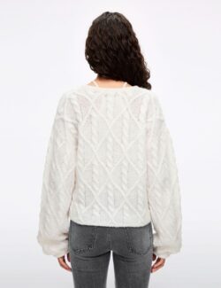 This knit sweater features a loose. cropped fit with a V-neck design. with lurex threads shimmering across a retro cable-knit texture. creating a romantic. dreamy effect. Made from a mohair and merino wool blend. it offers a cloud-like lightness and softness. with a misty. gentle surface that is warm and comfortable to wear. Cable-Knit Diamond…