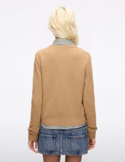This knit sweater features a crew neck design with plaid pattern elements reminiscent of a shawl. creating a layered. layered look. The single row of metal buttons on the placket adds a vintage touch. Made from a blend of merino wool and cashmere. the fabric is soft. elastic. and fluffy. offering structure and warmth for…