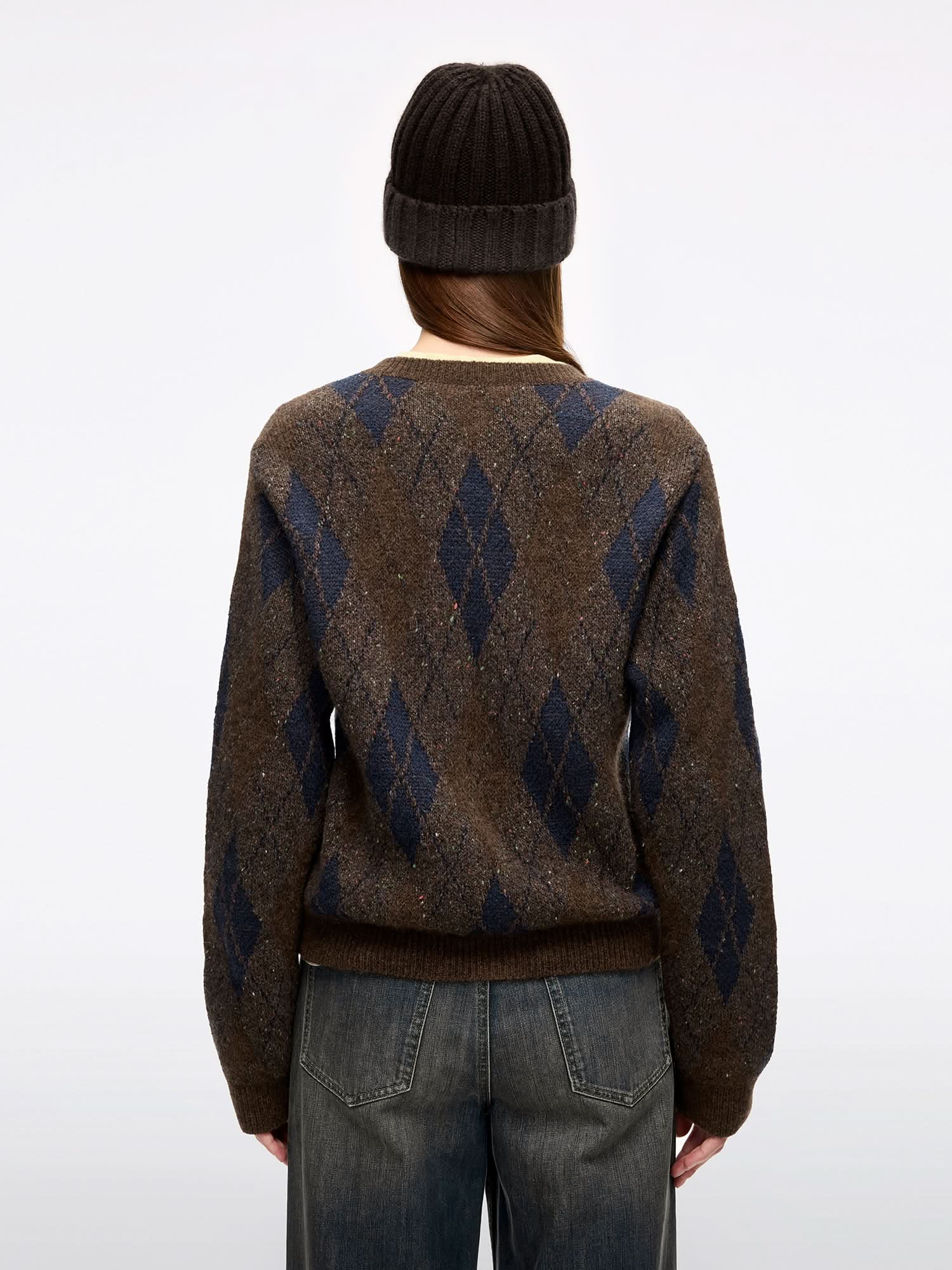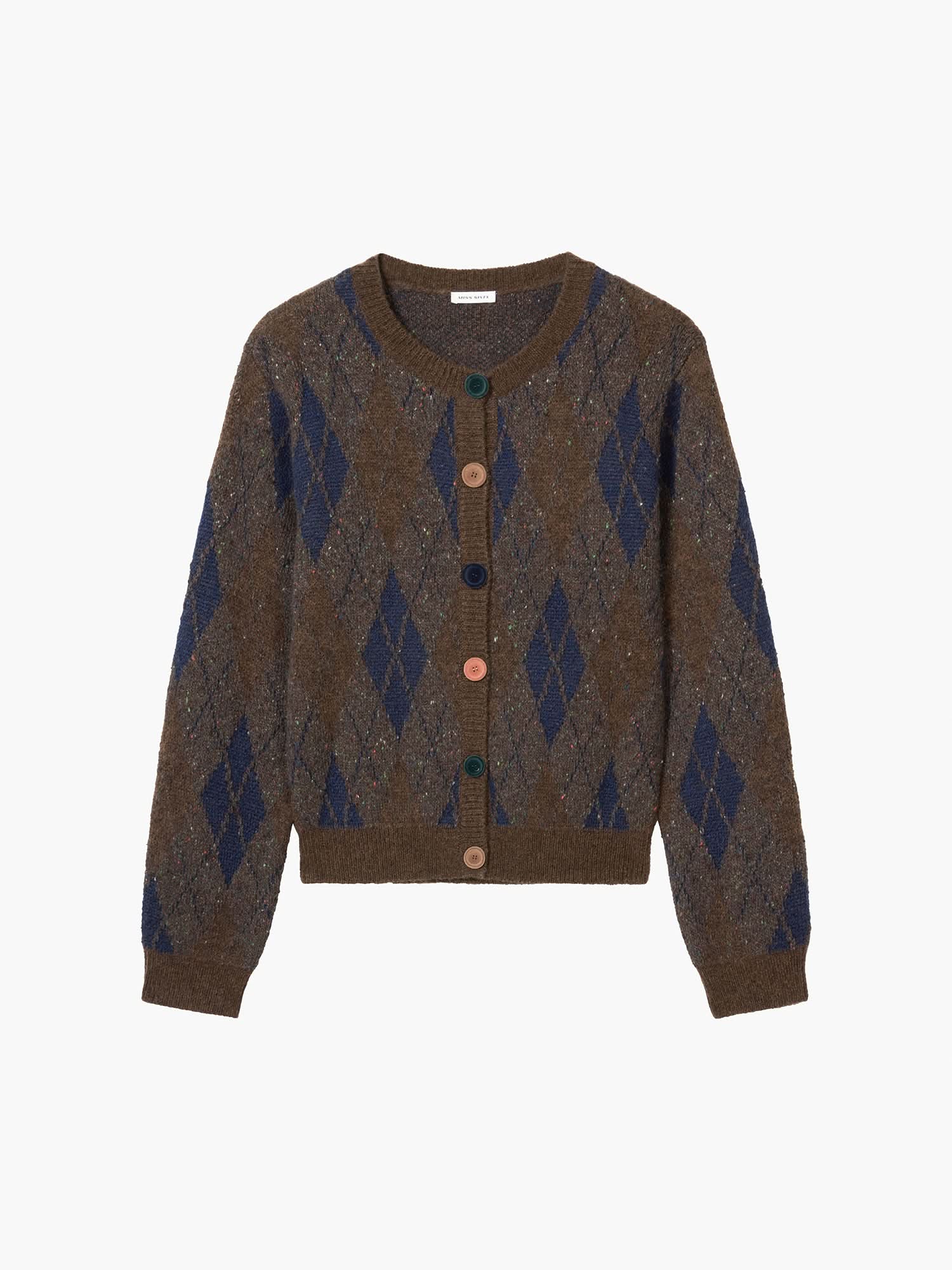 This knit cardigan features a crew neck and a fitted. cropped silhouette. with velvet-covered buttons adorning classic check-patterned fabric. offering a retro yet refined and elegant look. Made from a blend of alpaca. sheep wool. and mohair yarns of varying thickness. the ribbed texture naturally stretches with the body for a comfortable fit.