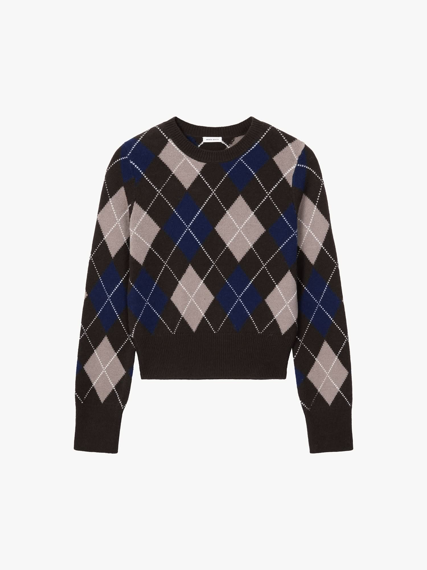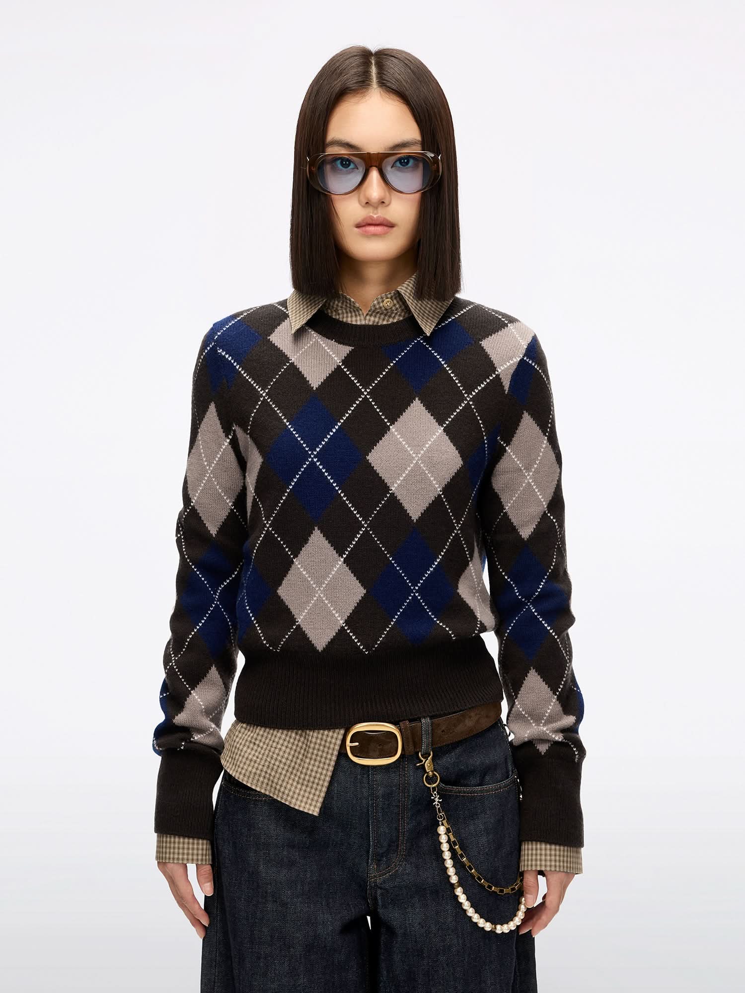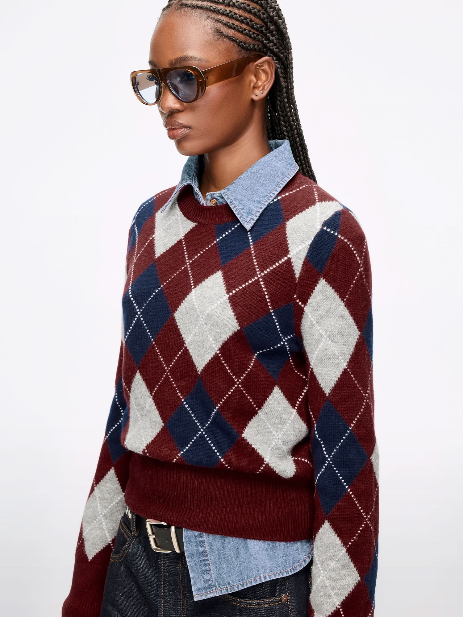 This knit sweater features a fitted. cropped silhouette with a crew neck. combining retro contrast-colored argyle patterns with modern tailoring for a timeless. classic look. Carefully crafted from merino wool. it offers a soft. plush feel. comfortable wear. and a rich. naturally elegant color.