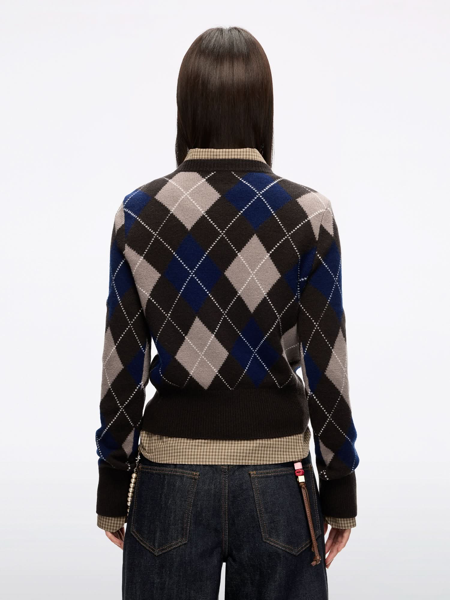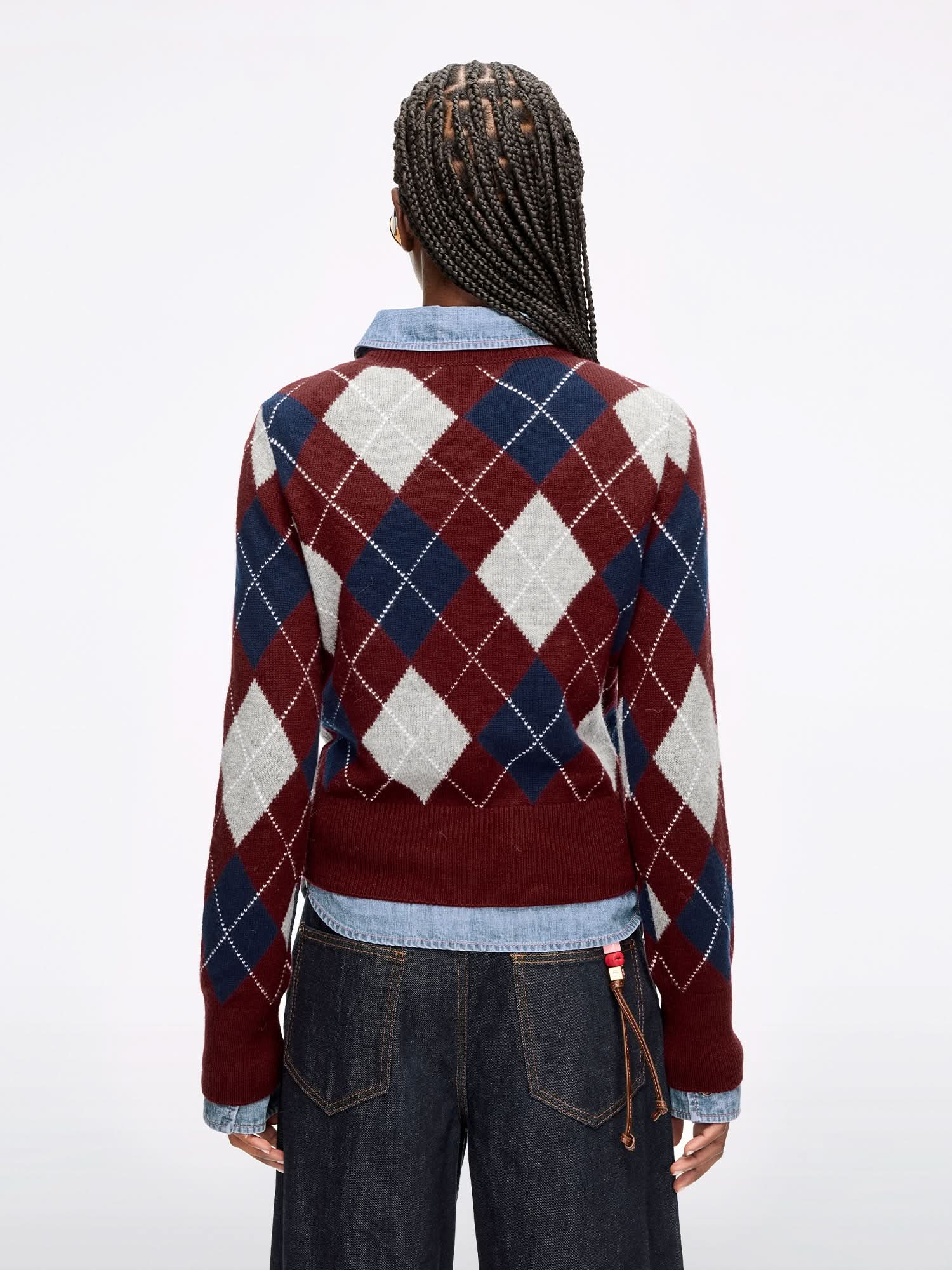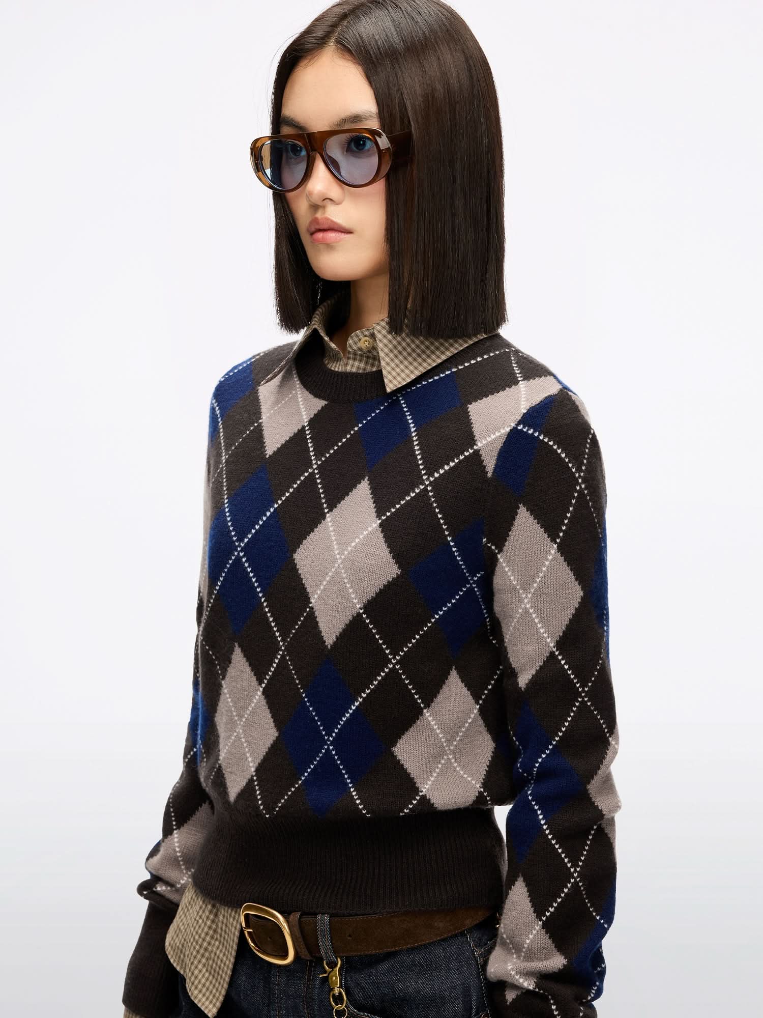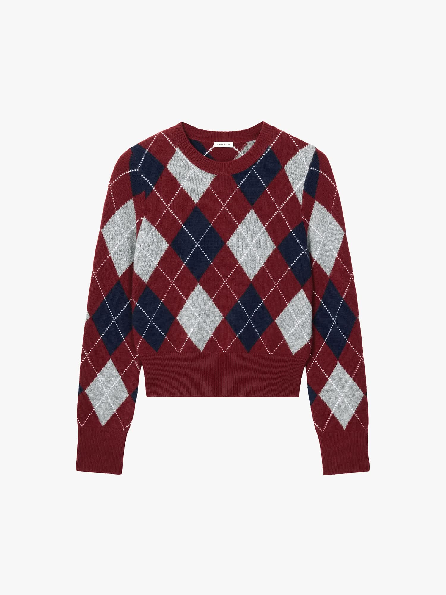 This knit sweater features a fitted. cropped silhouette with a crew neck. combining retro contrast-colored argyle patterns with modern tailoring for a timeless. classic look. Carefully crafted from merino wool. it offers a soft. plush feel. comfortable wear. and a rich. naturally elegant color.