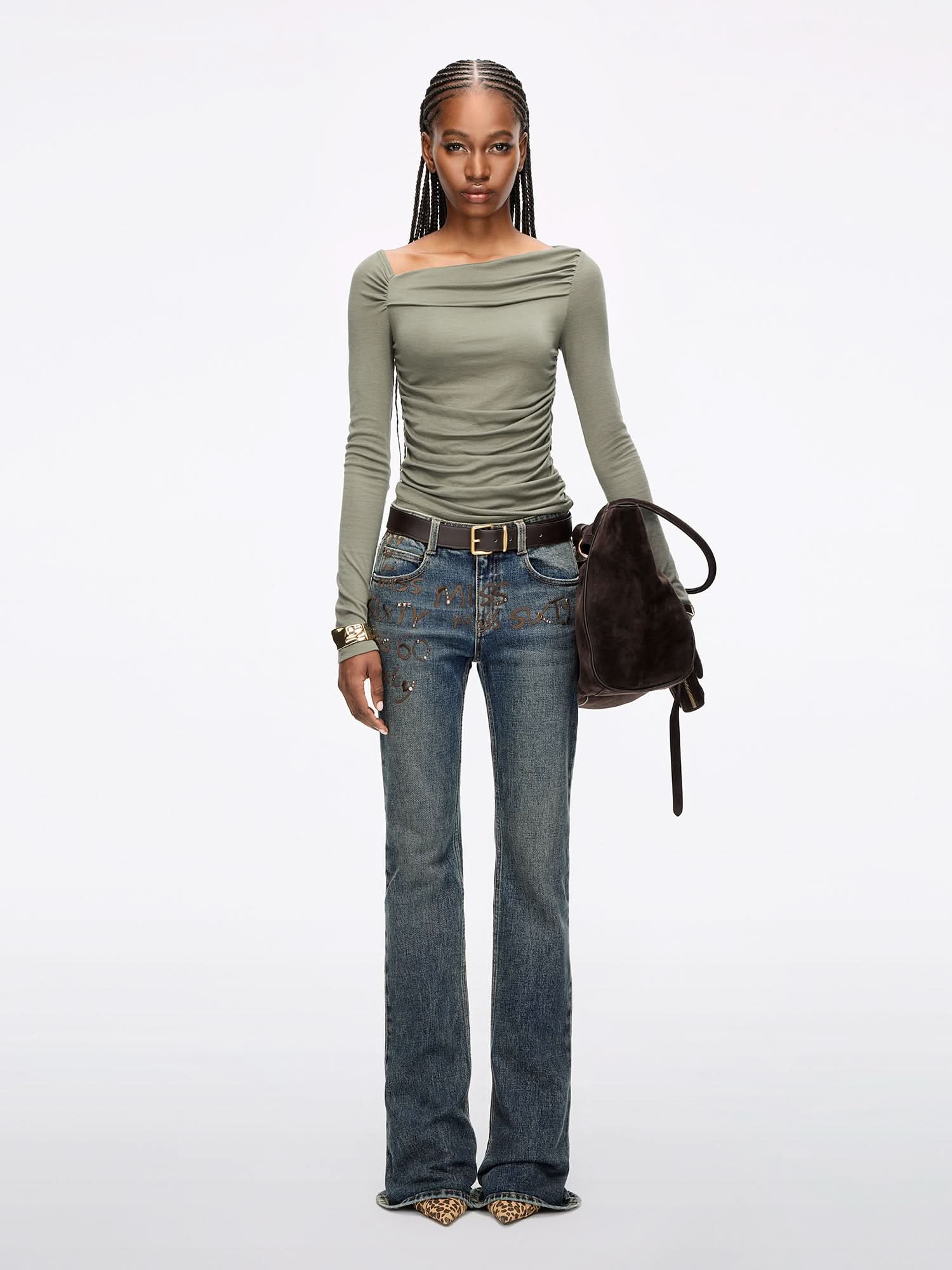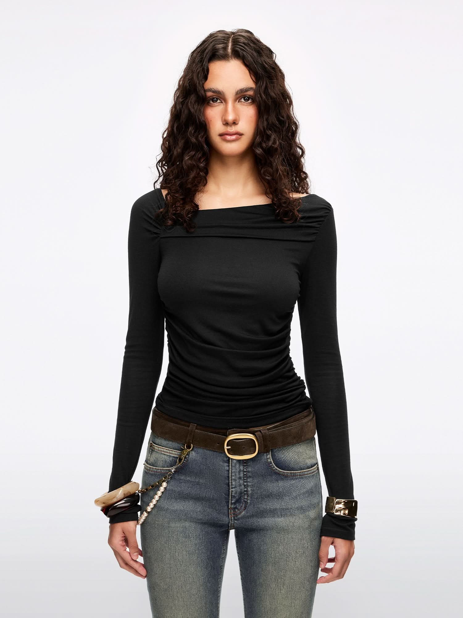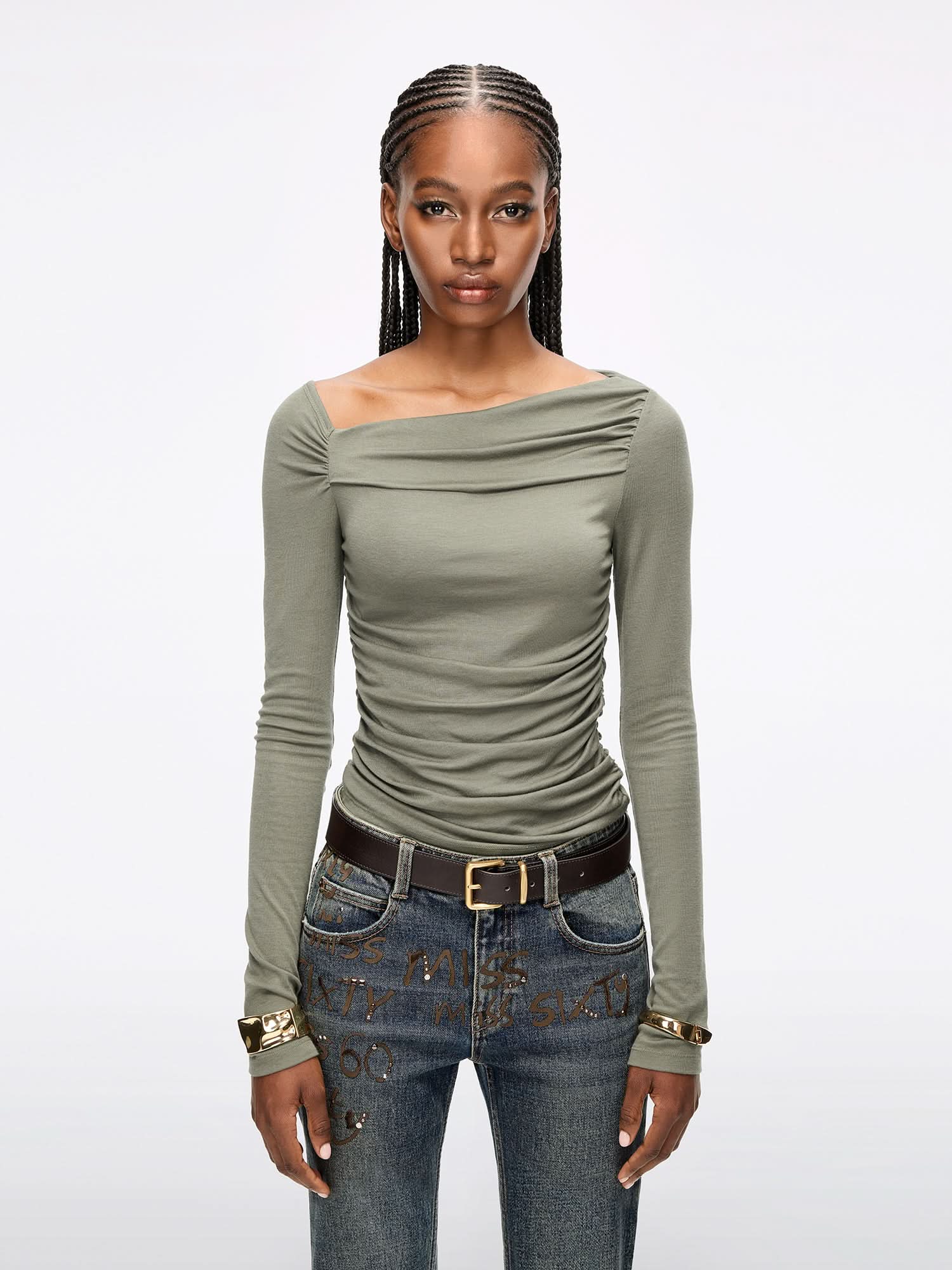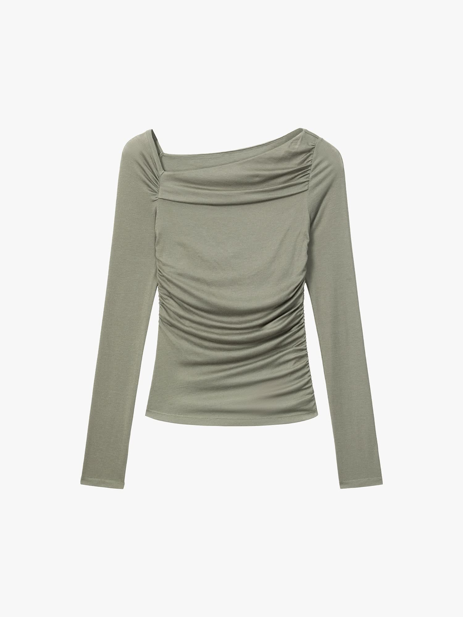 This long-sleeve T-shirt features an asymmetrical neckline with a slim fit. enhanced by pleated draping for a naturally contoured silhouette. Crafted from a blend of lyocell and merino wool with added elastic fibers. the fabric is stretchy yet form-fitting. offering a soft. comfortable. and drapey feel against the skin.