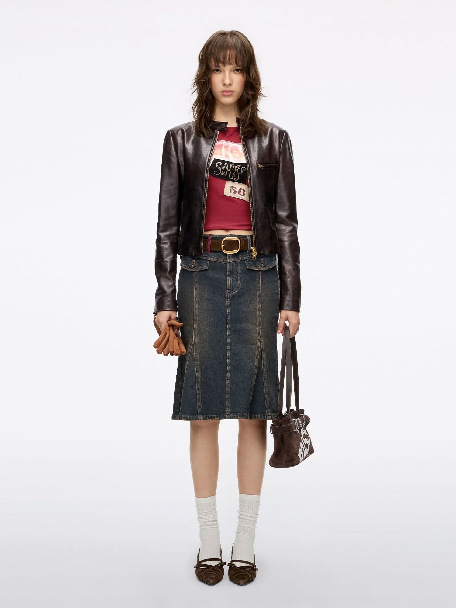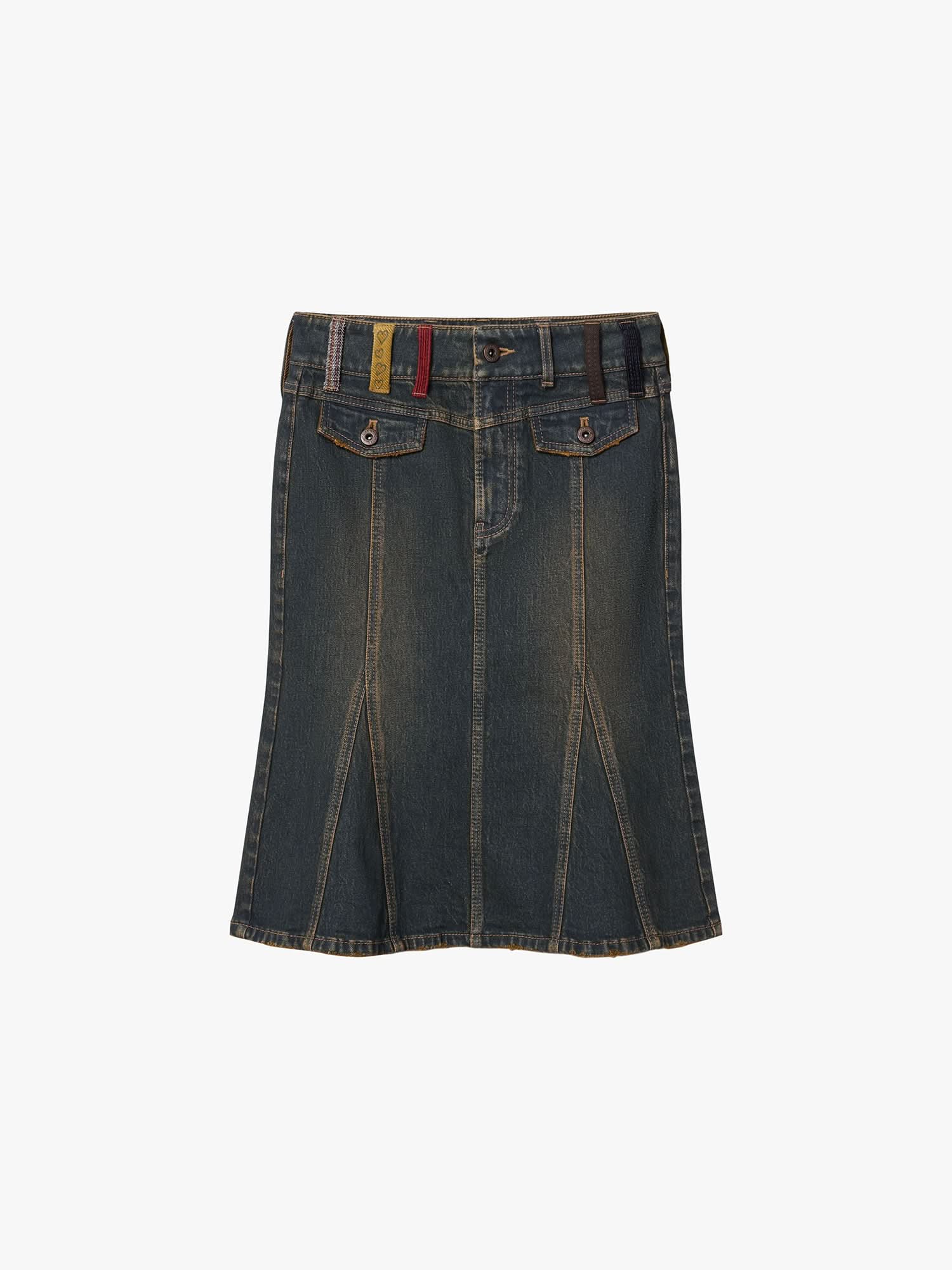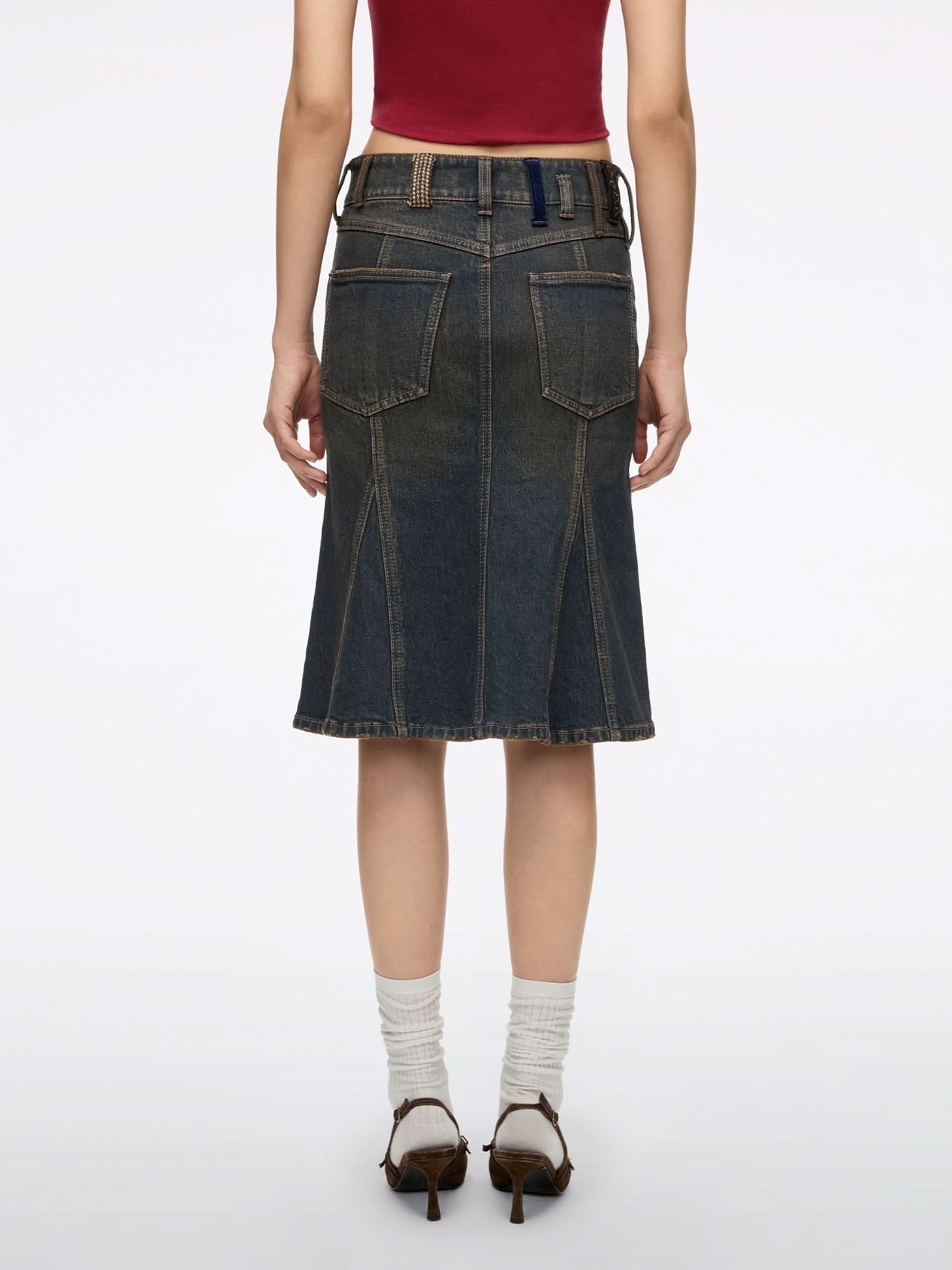 Trendy denim skirt features a knee-length cut with a mermaid hem and varied multi-belt-loop waistbands for added style. Made from high-cotton denim. it is soft with slight stretch. Multiple washes create a vintage. worn-in effect.