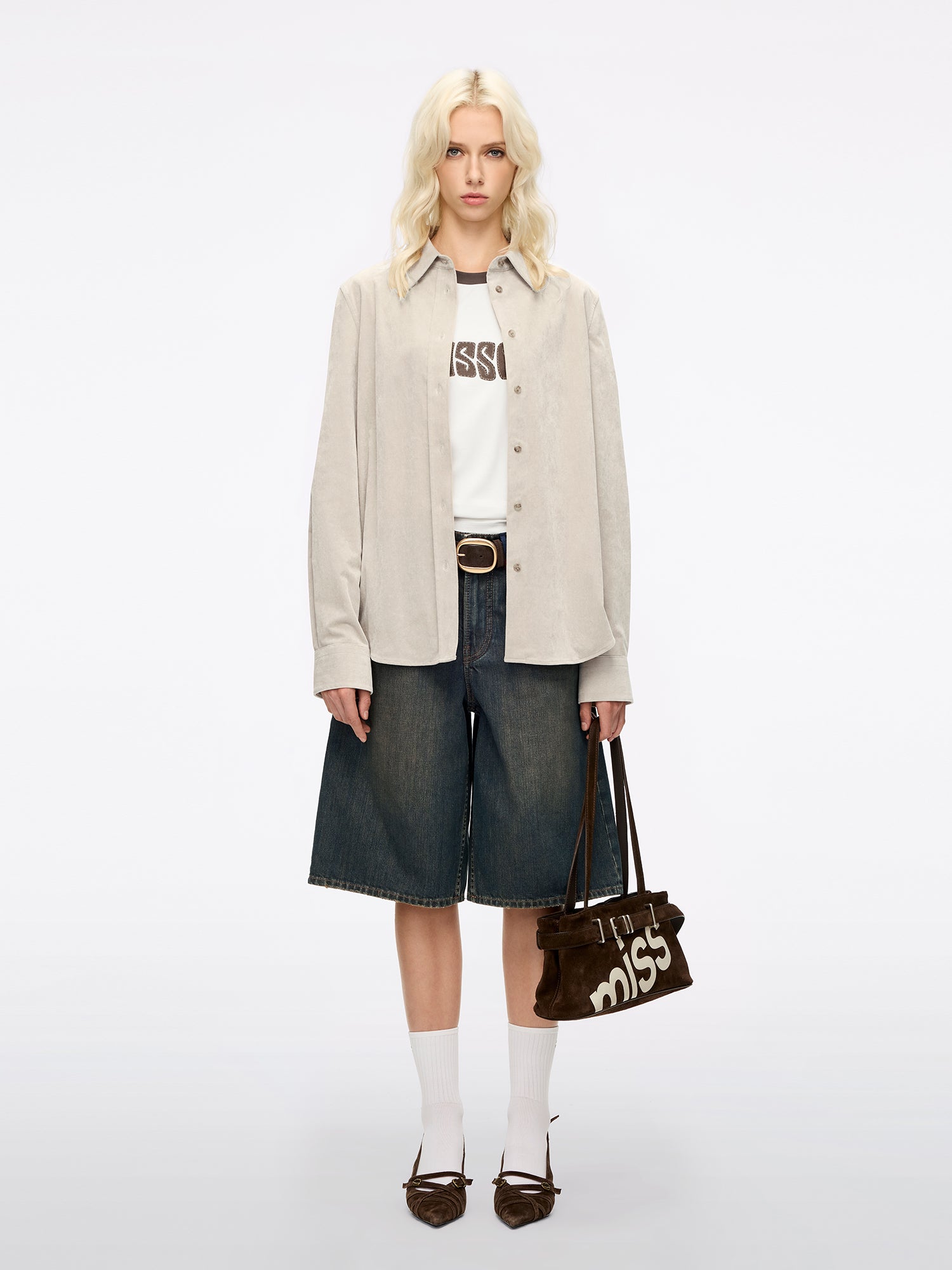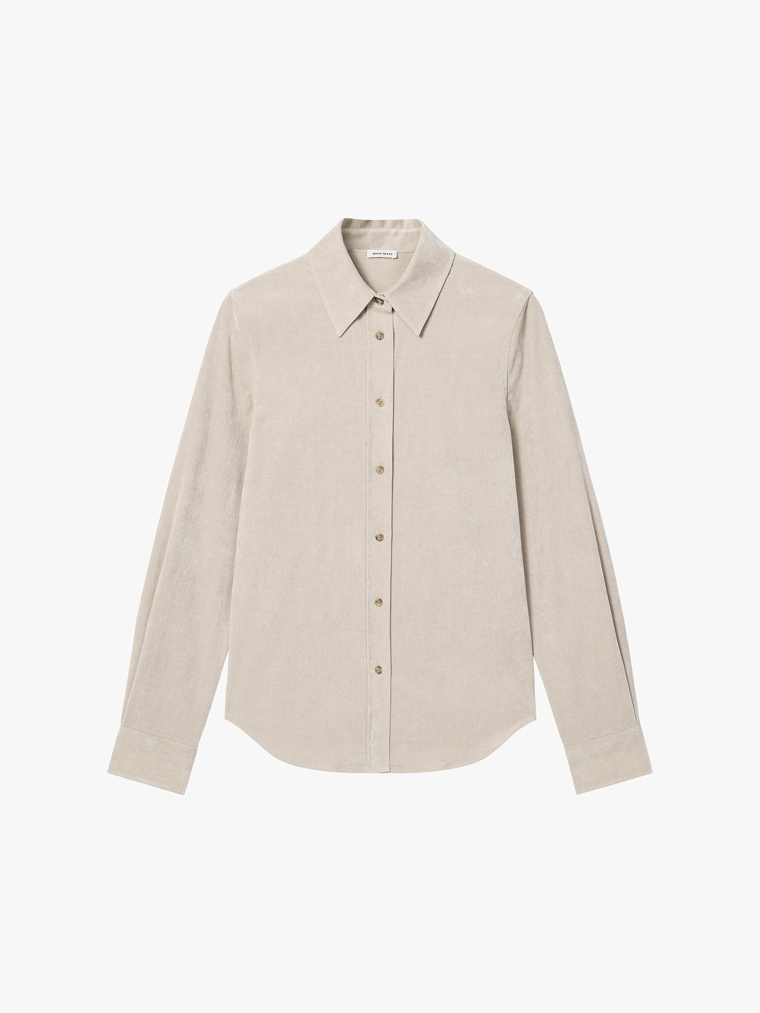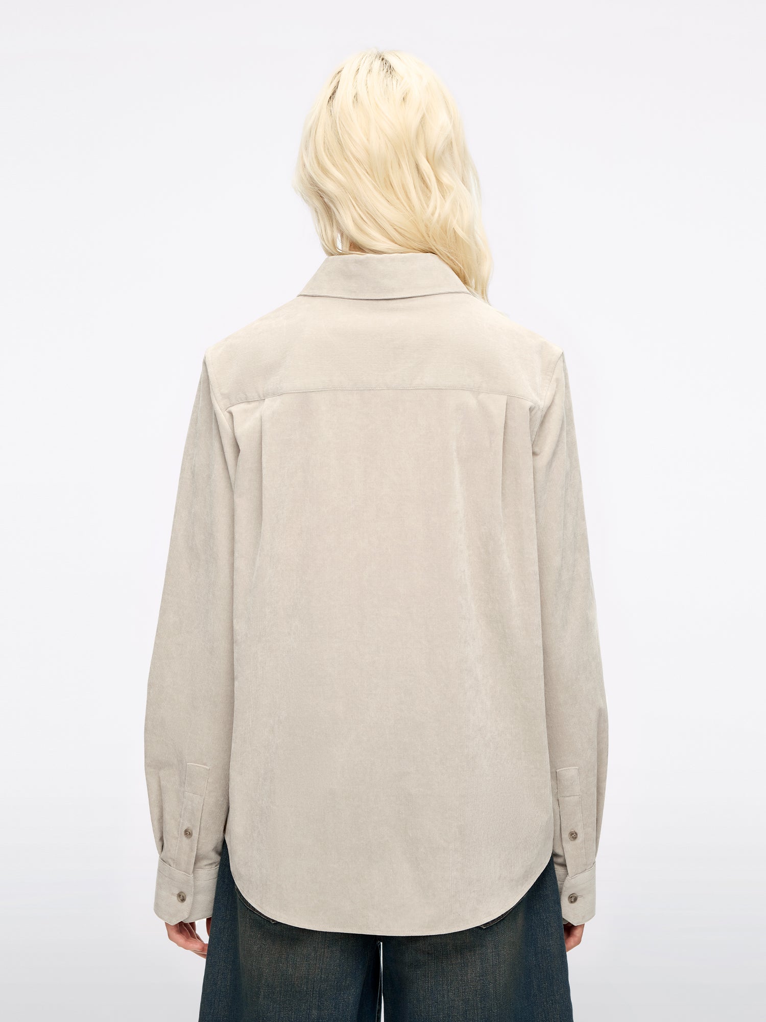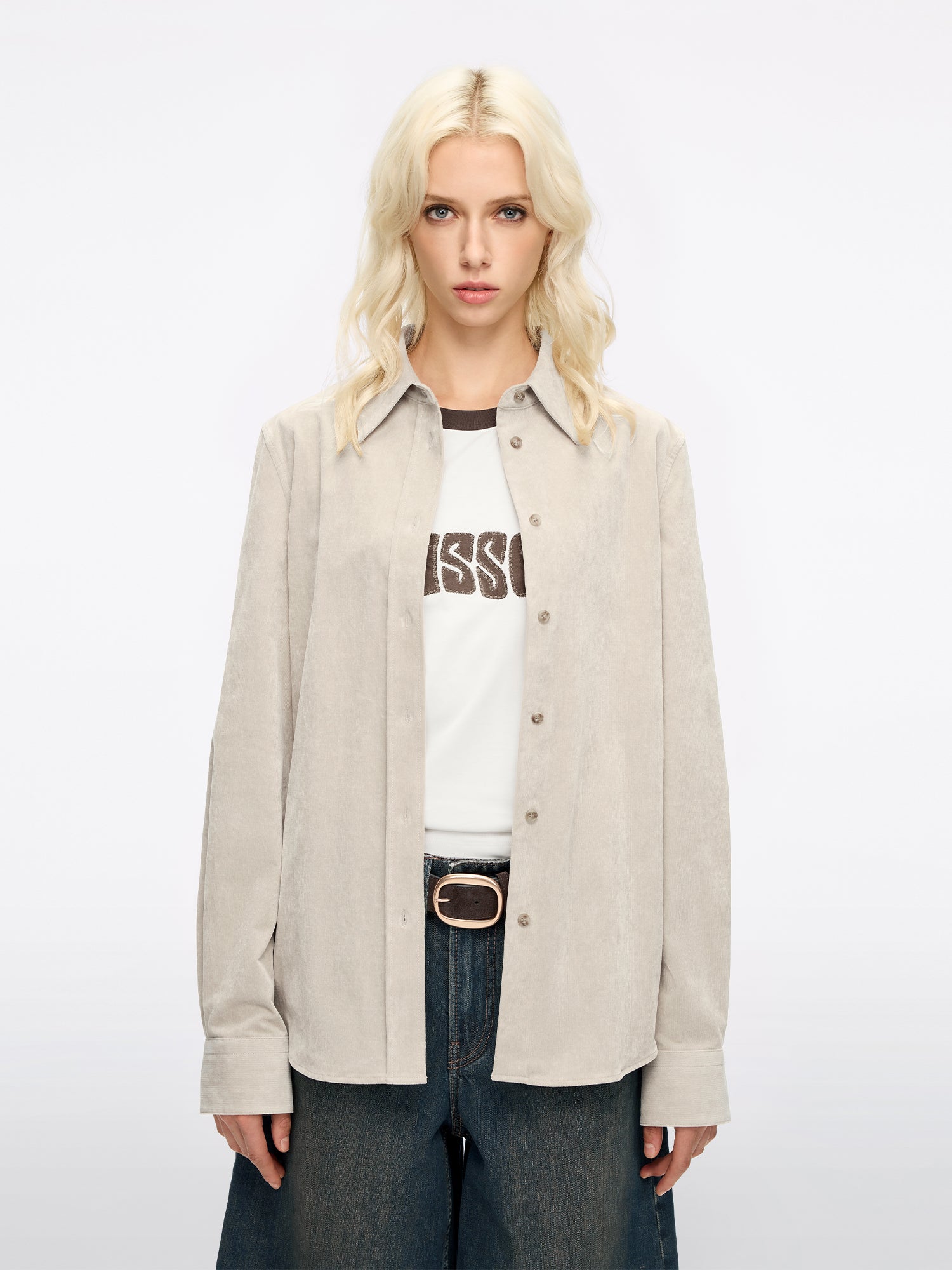 The shirt features a fitted silhouette and mid-long length. with a single-breasted front that complements its clean. minimalist solid color. Crafted from corduroy fabric. it naturally exudes a vintage vibe. The material is fine and resilient. with a refined. even surface texture and a structured yet fluid drape.