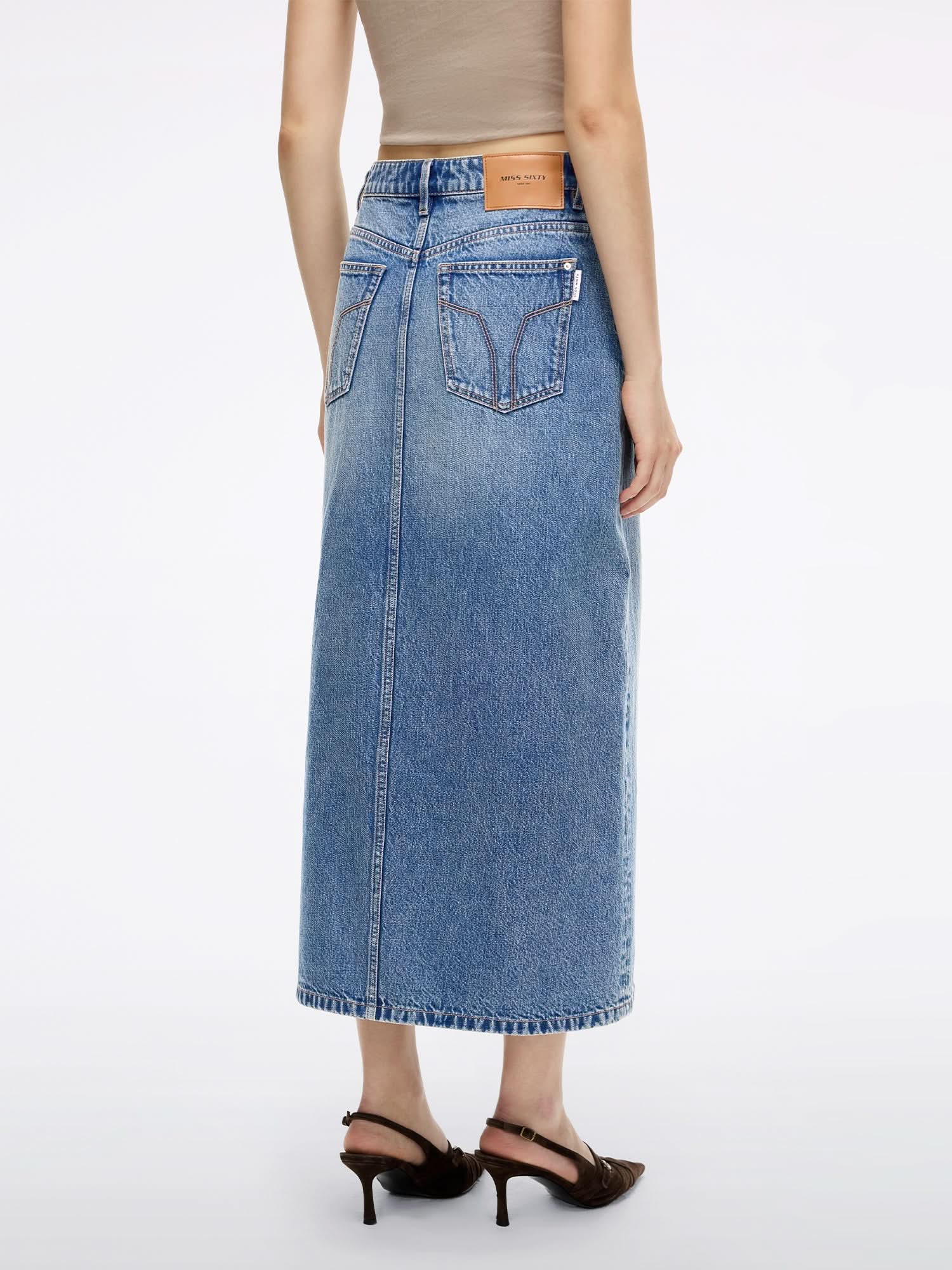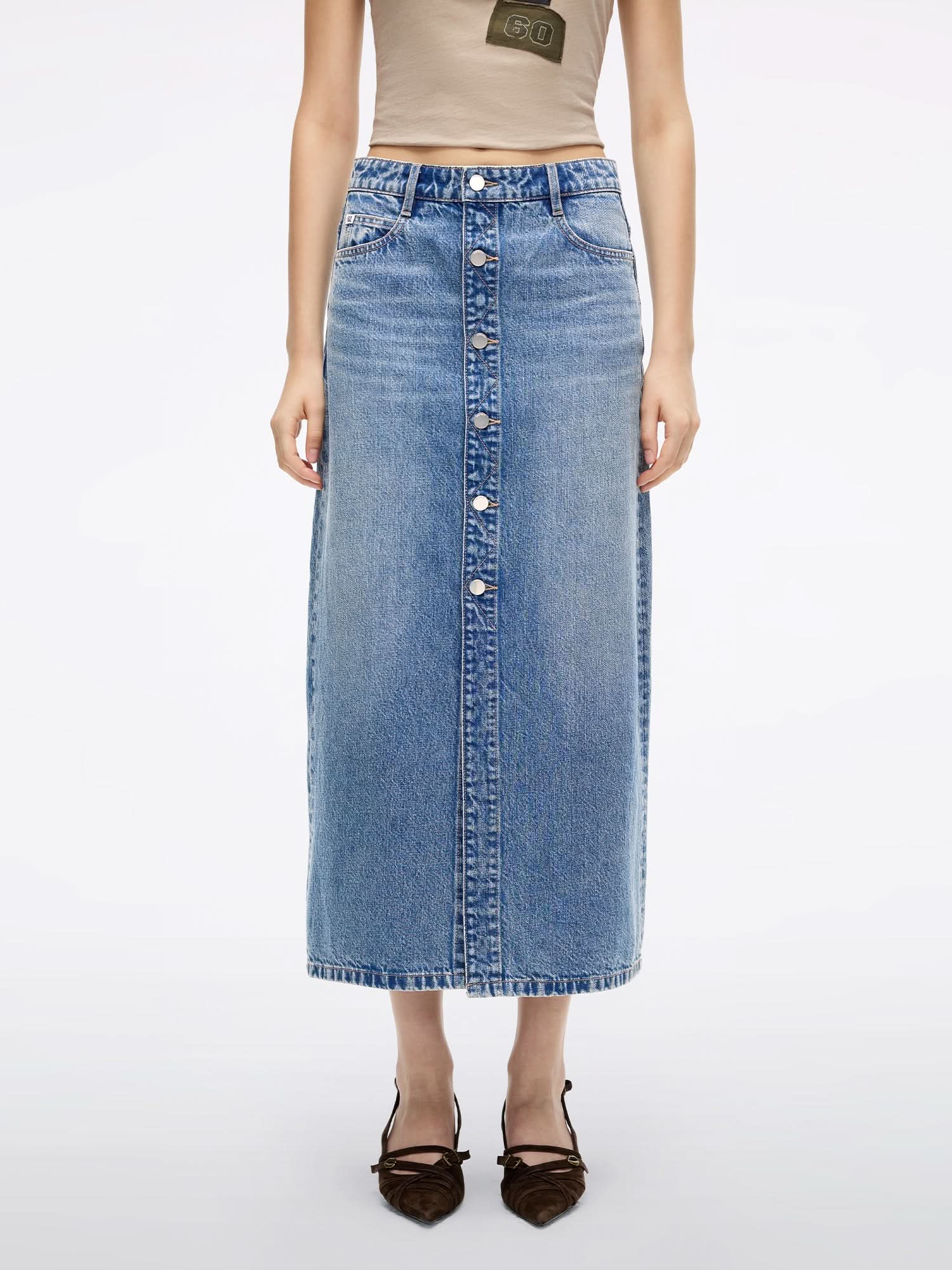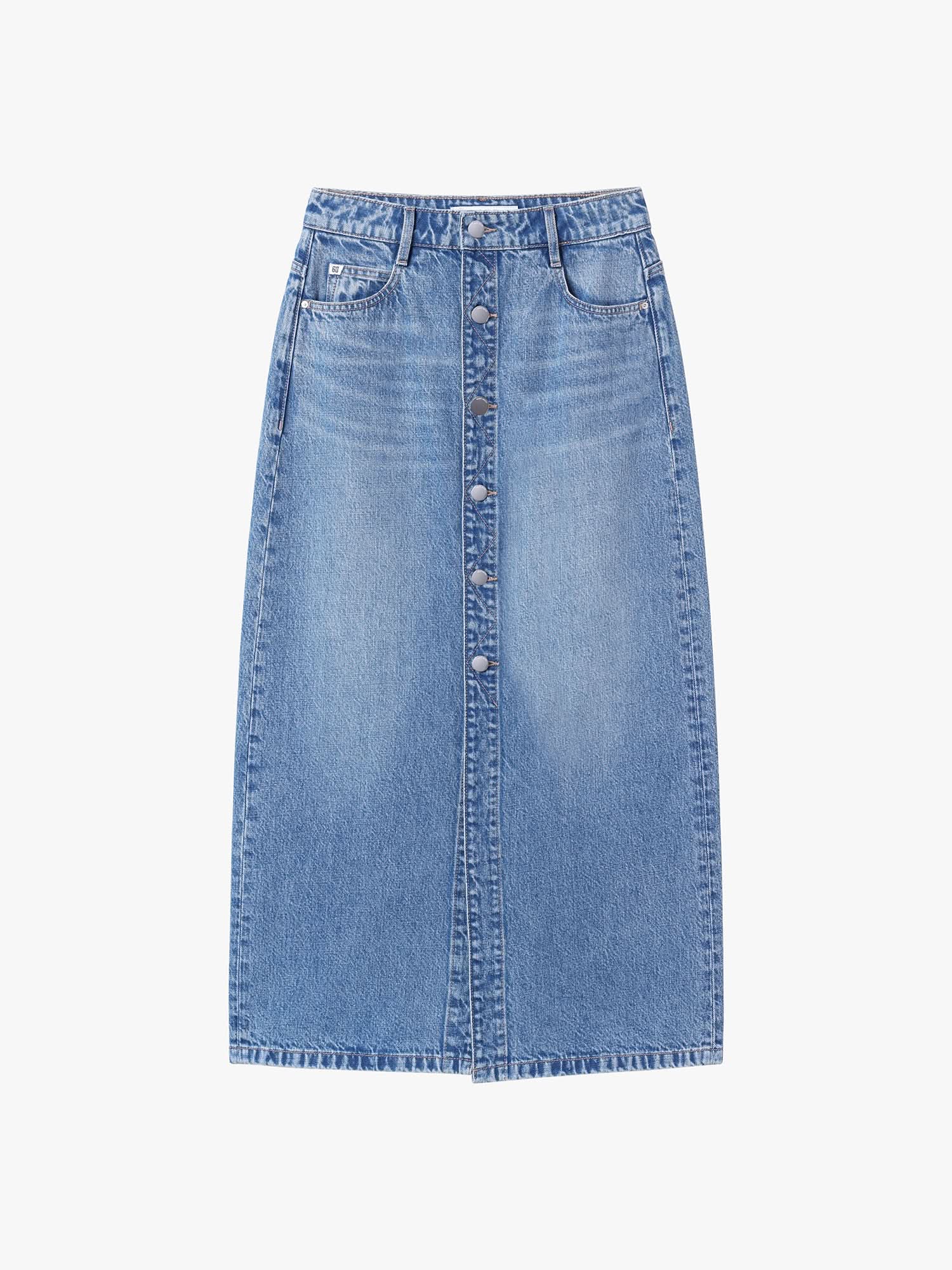 This denim skirt features an over-the-knee length and a mid-rise waist design. The single row of buttons combined with hidden snaps adds layered detailing for visual interest. Made from medium-blue cotton denim. the fabric feels soft and comfortable. Each piece is uniquely treated with a wash process to create a distinct vintage effect.