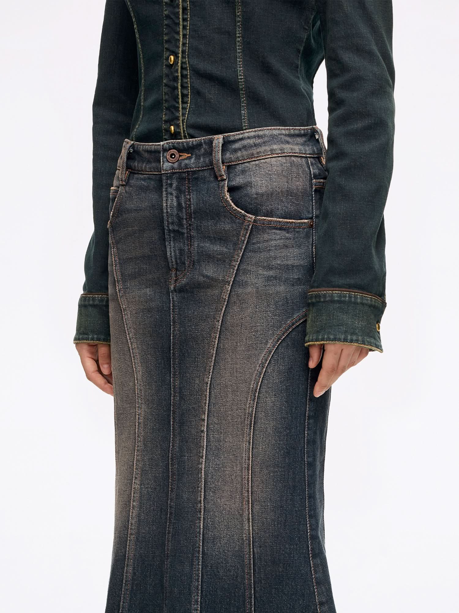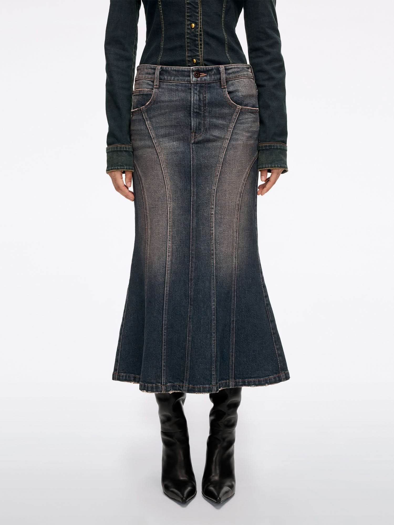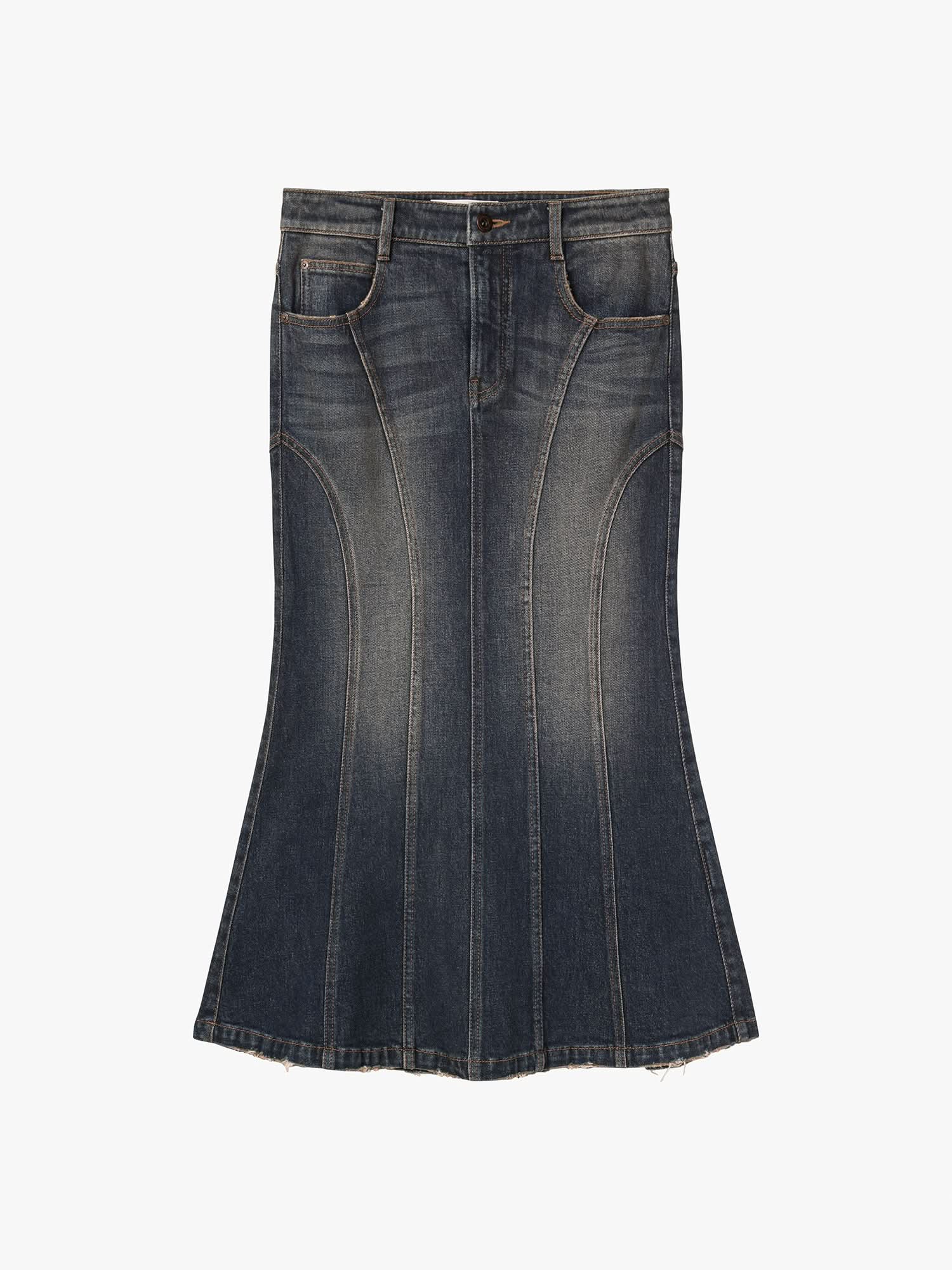 Trendy long denim skirt featuring a fishtail hem that accentuates a flattering silhouette. with a detachable charm at the back waist for added detail. Made from retro-style denim. it offers a soft. comfortable. and stretchy feel. Multiple washes give each piece a unique retro look.