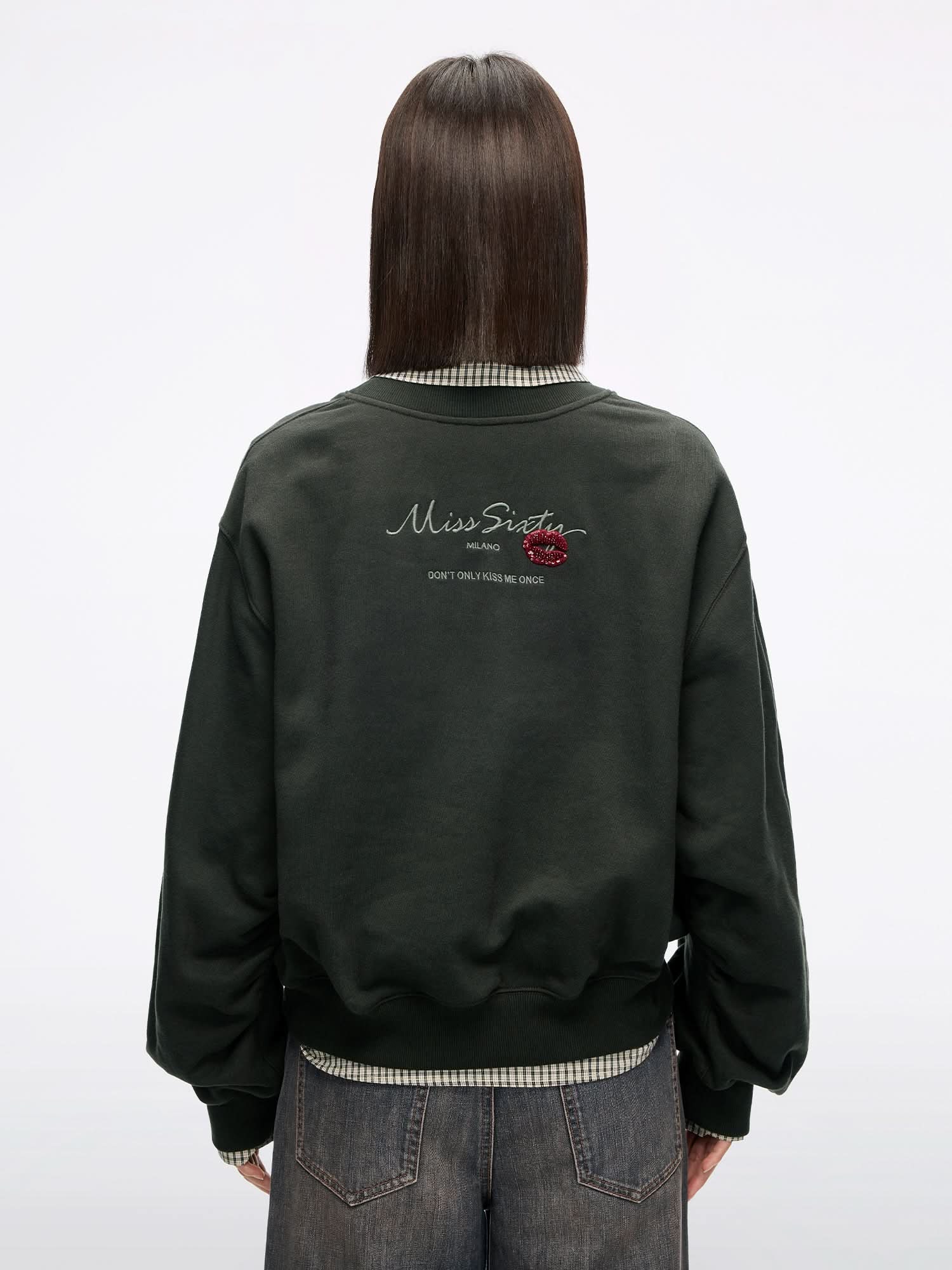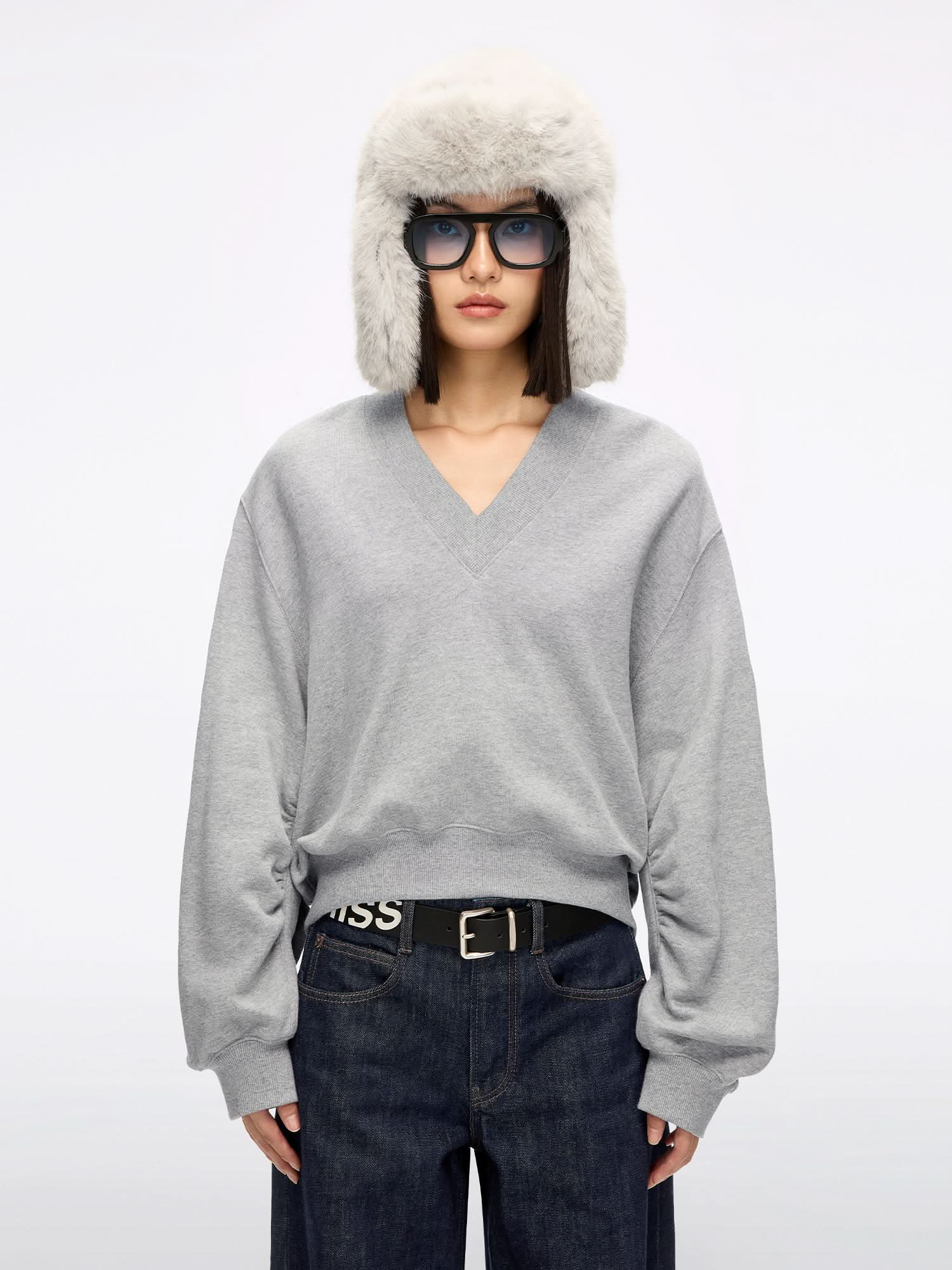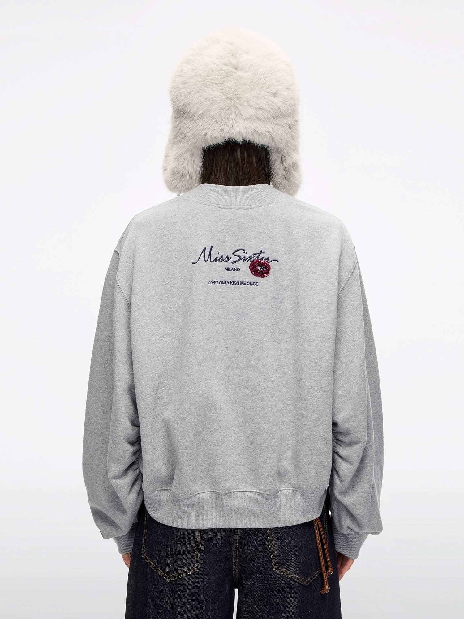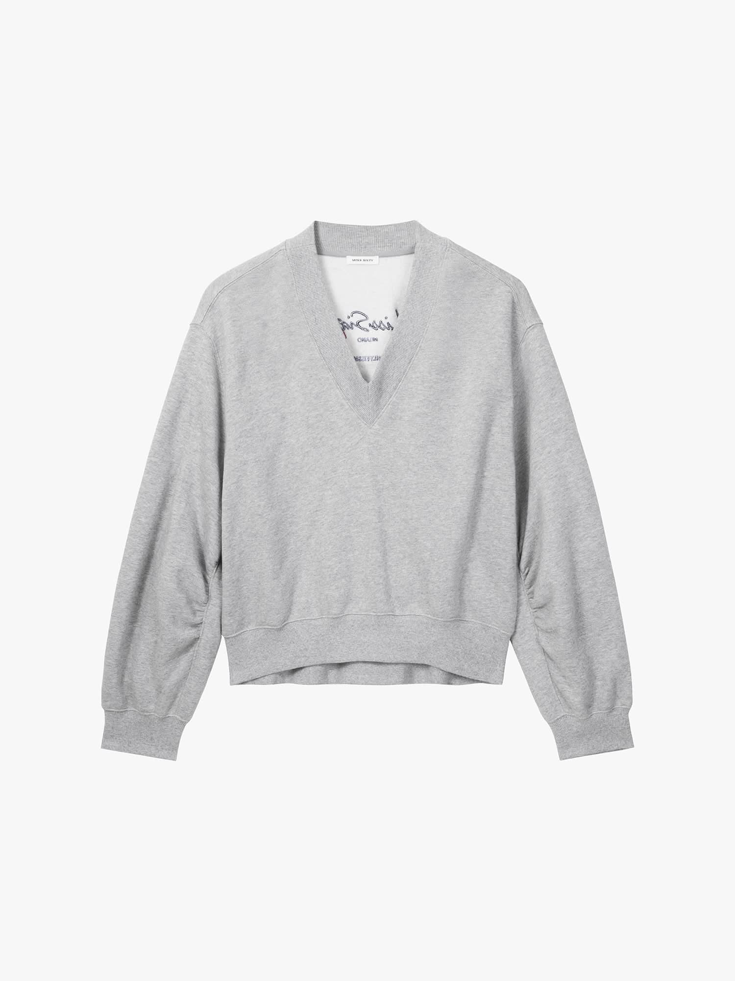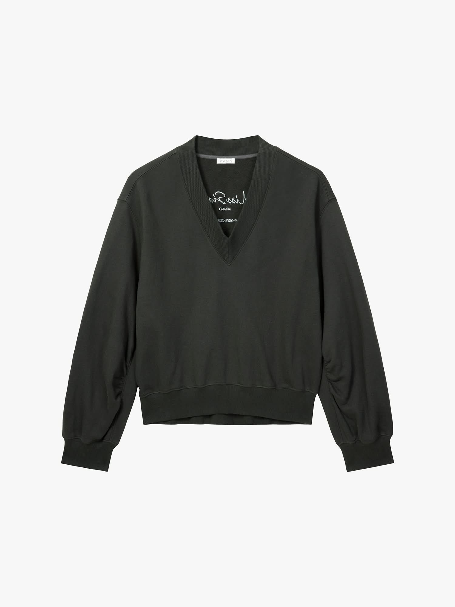 This sweatshirt features a V-neck design with pleated long sleeves for a relaxed. voluminous look. The back is detailed with embroidered logos and slogans to express individual style. accented with beaded red-lip patches. Made from 100% cotton with a unique looped yarn structure. the fabric feels soft. plush. and cozy. providing warmth without heaviness.