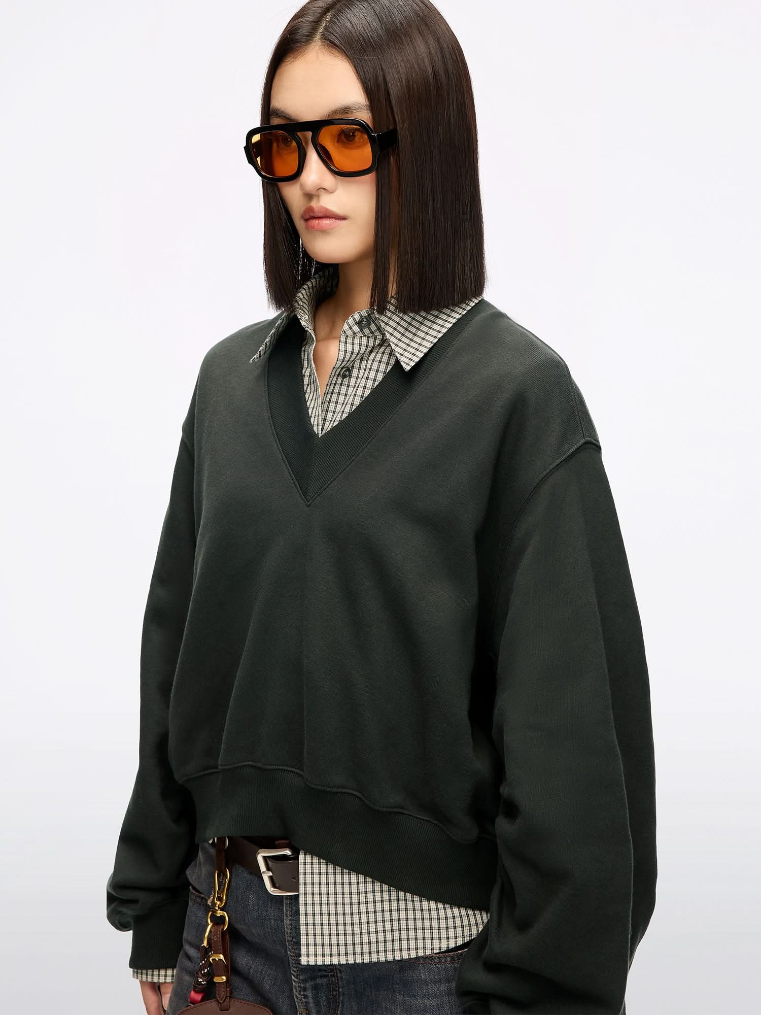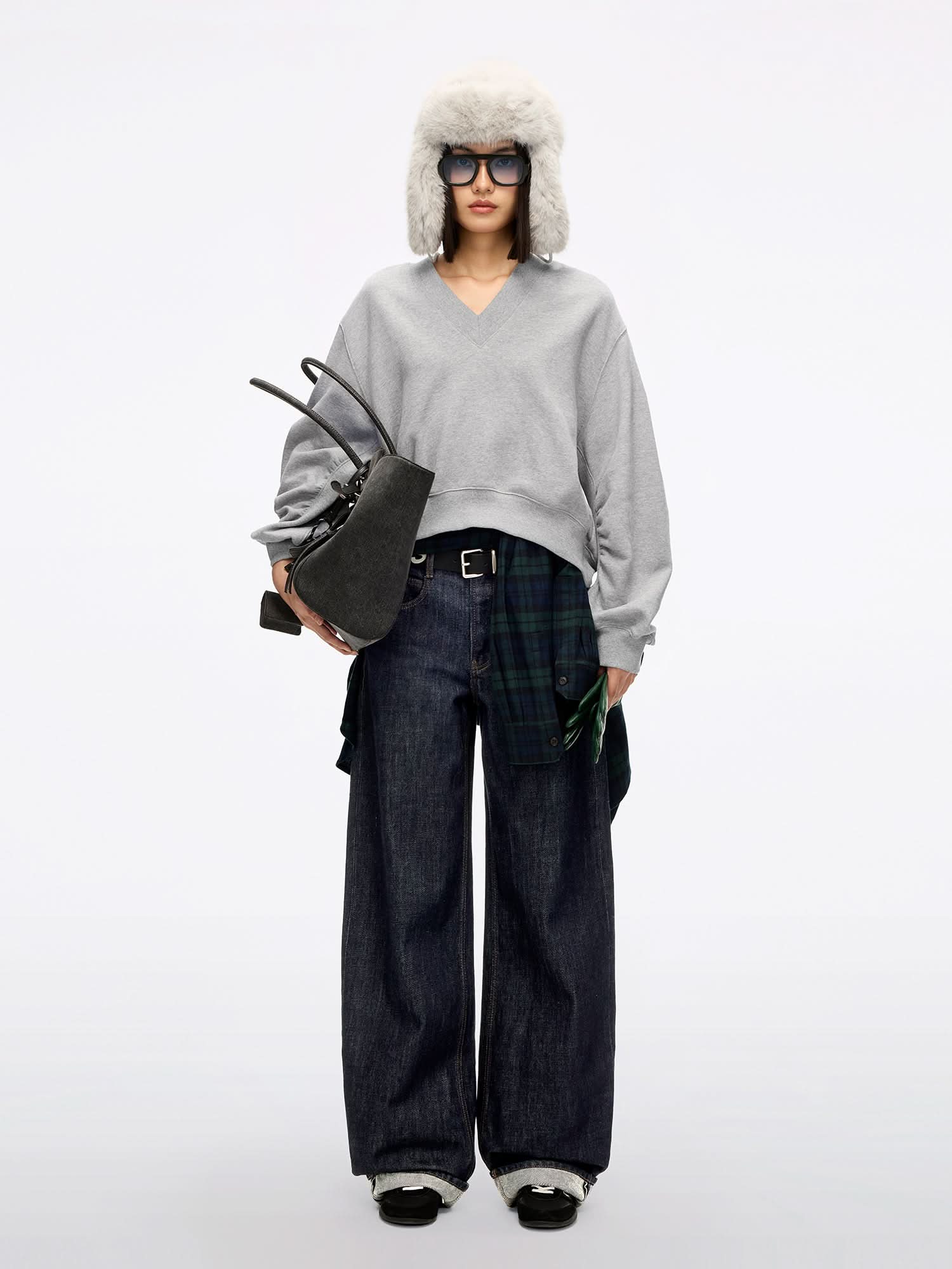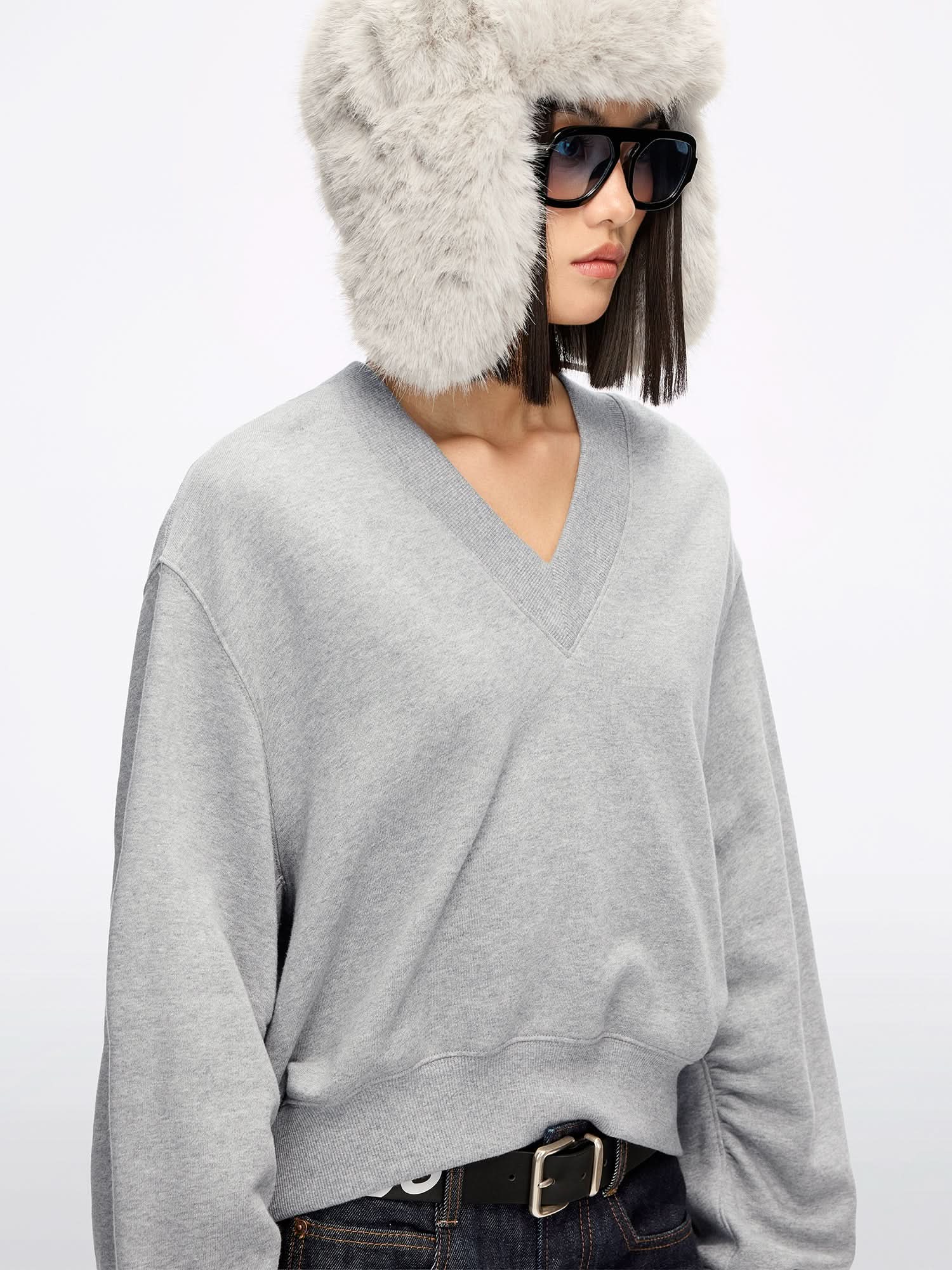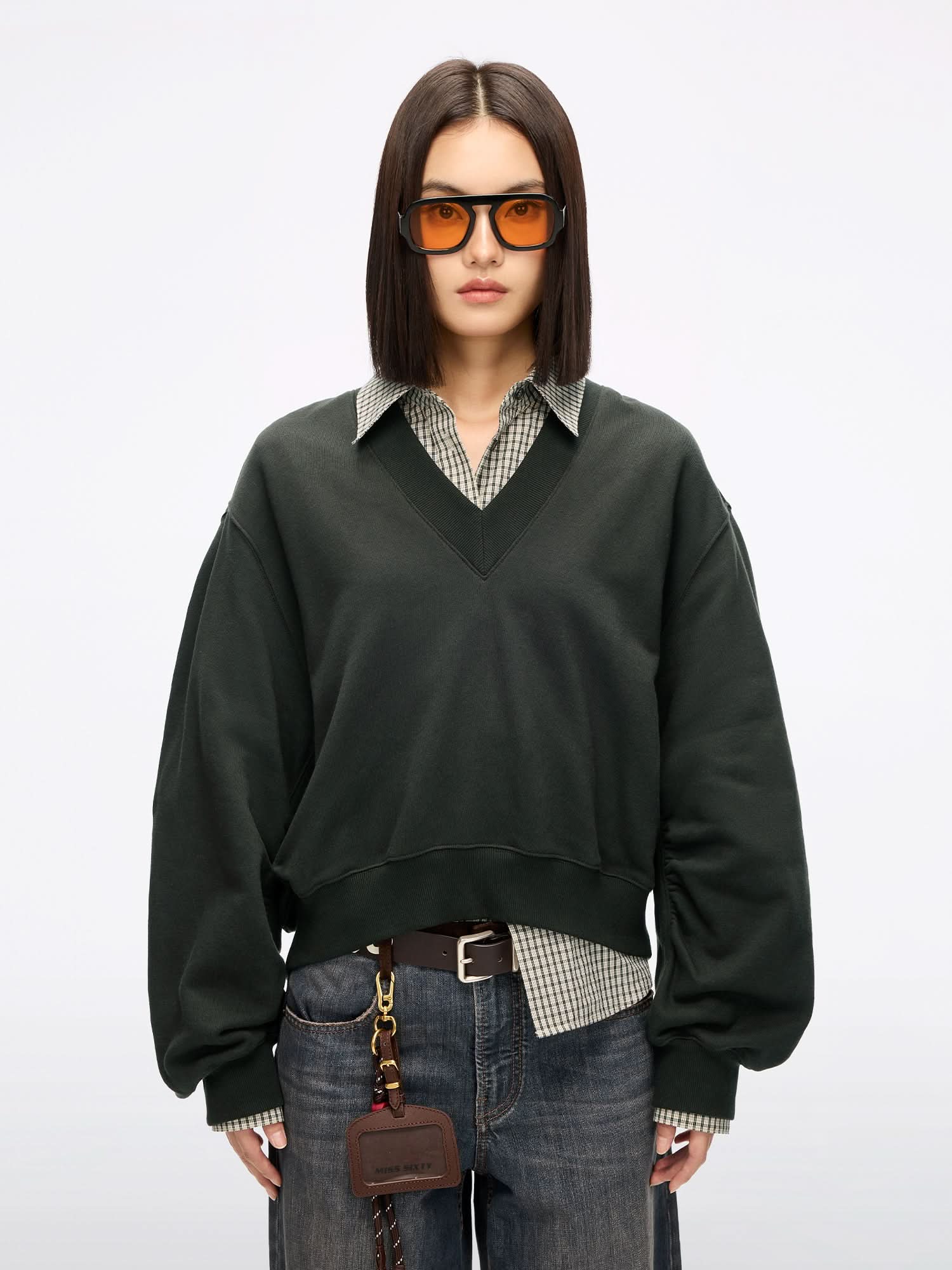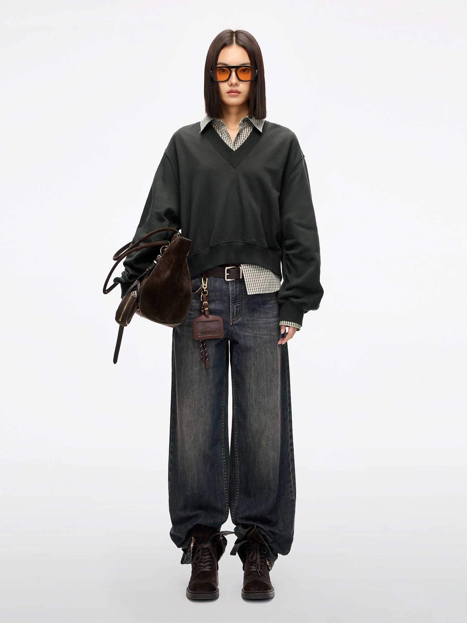 This sweatshirt features a V-neck design with pleated long sleeves for a relaxed. voluminous look. The back is detailed with embroidered logos and slogans to express individual style. accented with beaded red-lip patches. Made from 100% cotton with a unique looped yarn structure. the fabric feels soft. plush. and cozy. providing warmth without heaviness.