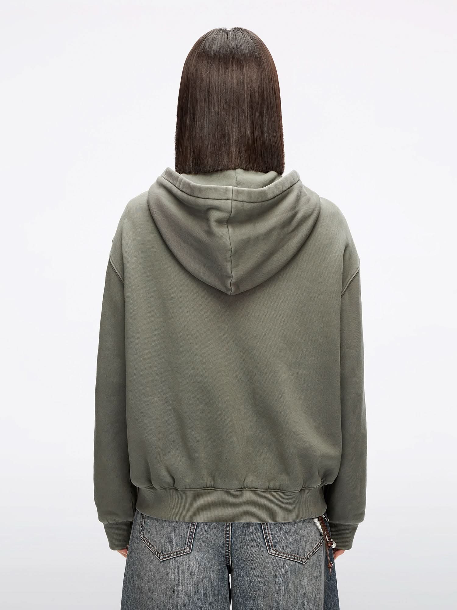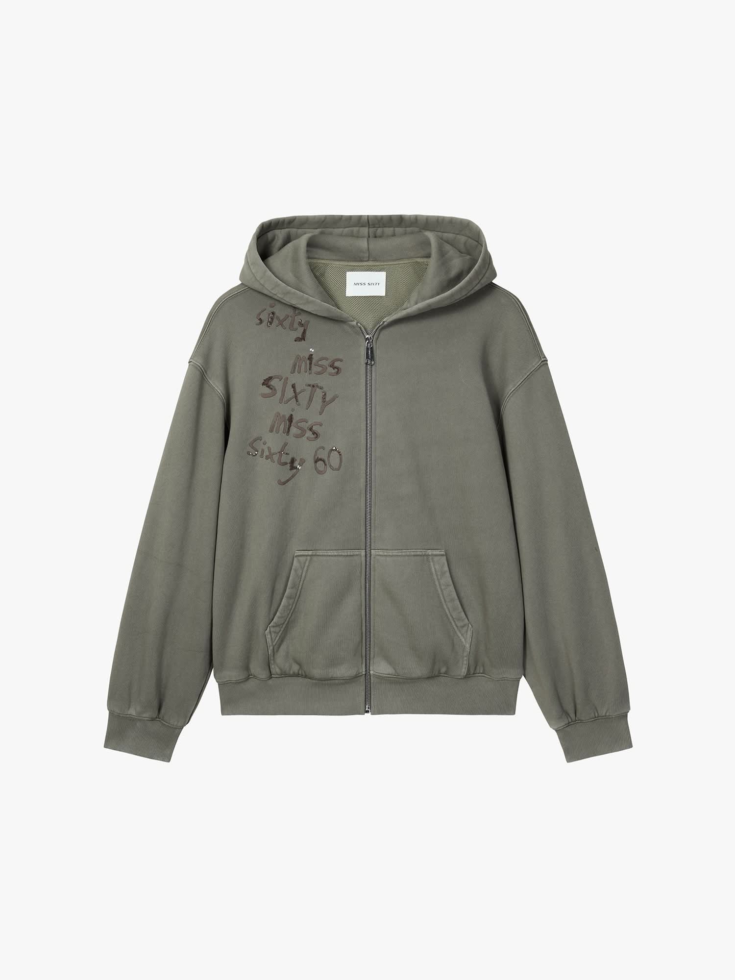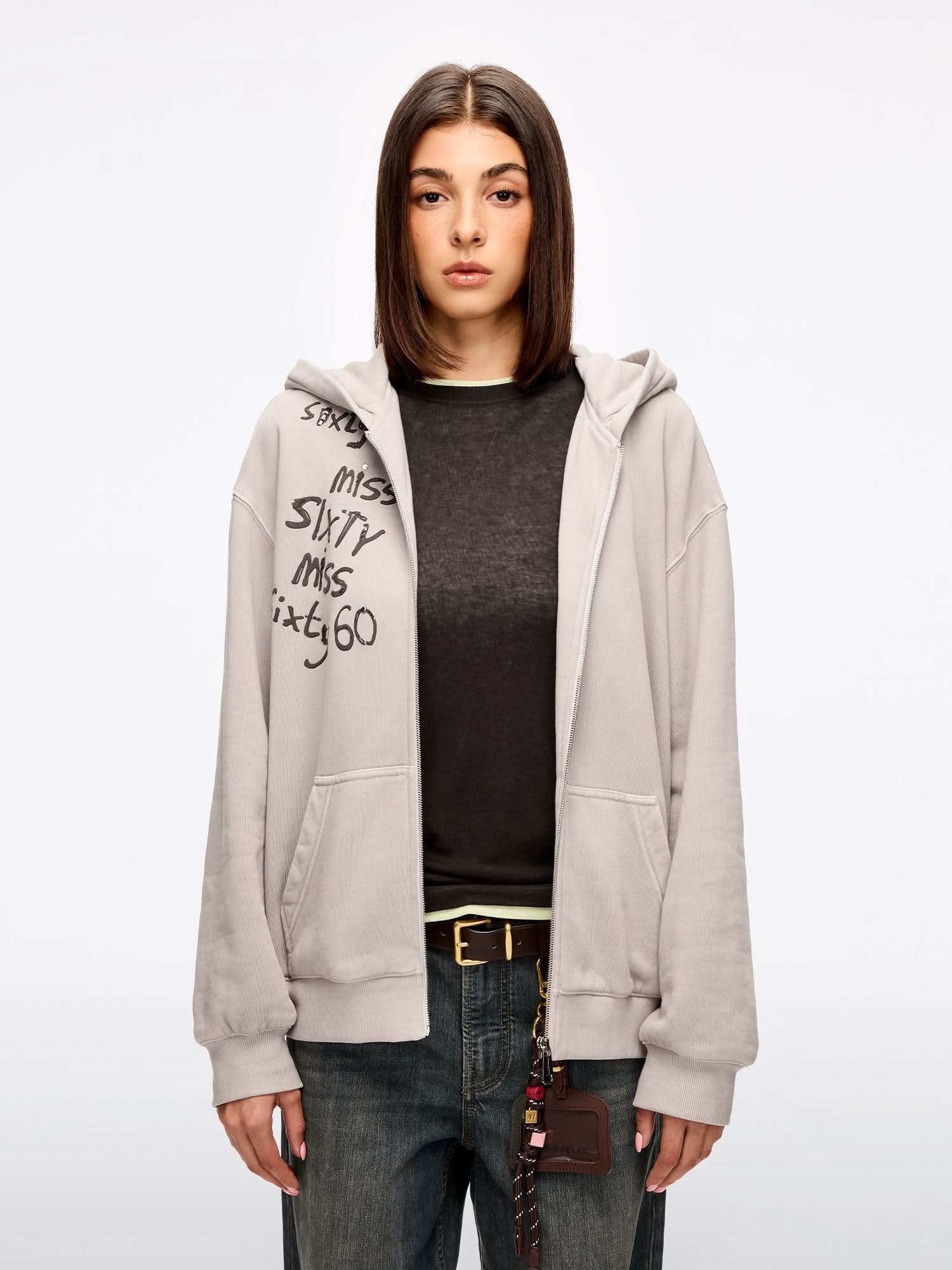 This zip-up hoodie features a zipper placket and hood. with a rhinestone-patched logo print accenting one side for a striking. eye-catching detail. Crafted from combed cotton knit. the brushed interior feels soft and plush against the skin. The relaxed fit provides cozy warmth without feeling heavy or restrictive.