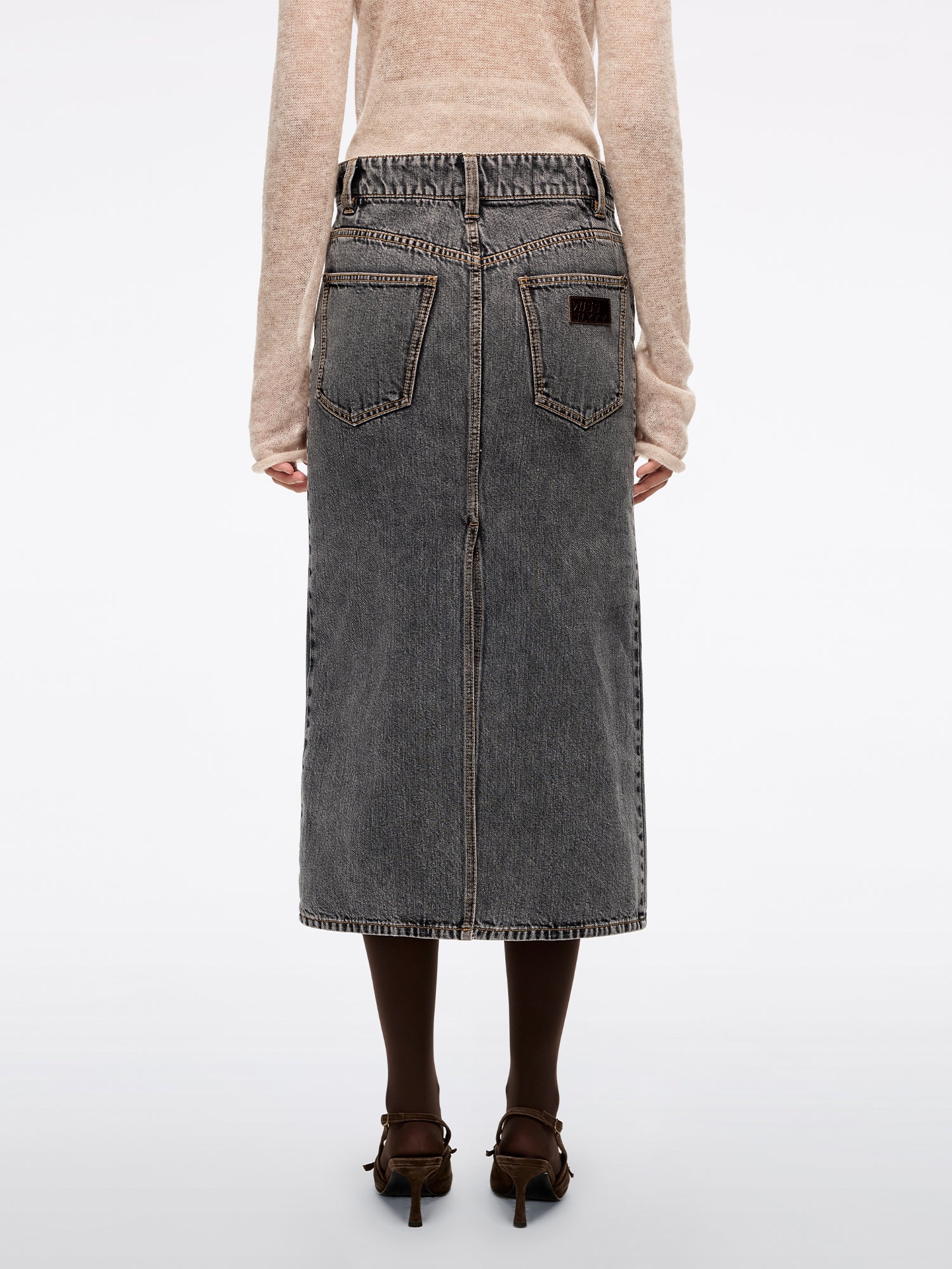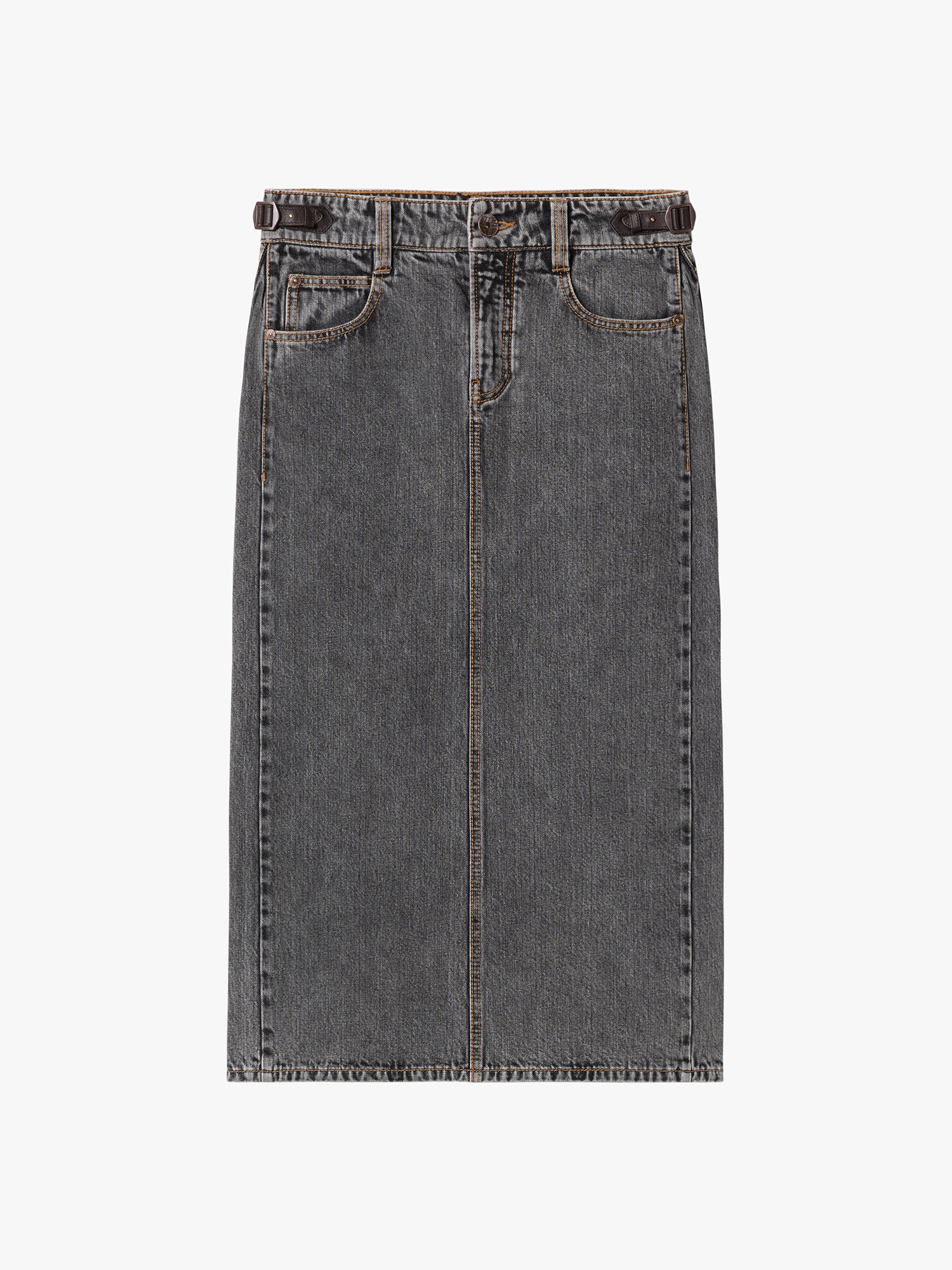 Trendy denim skirt features a long cut and mid-rise design. with leather belt loops at the waist that evoke a vintage revival. Made from 100% cotton denim. it has a soft and comfortable feel. vertical slub texture. and each piece is uniquely treated with multiple washes and processes.