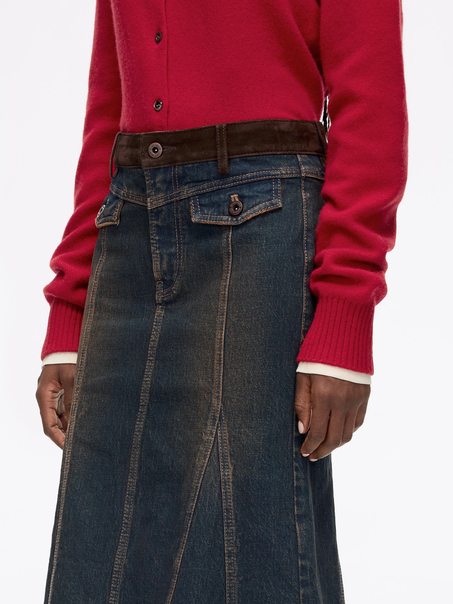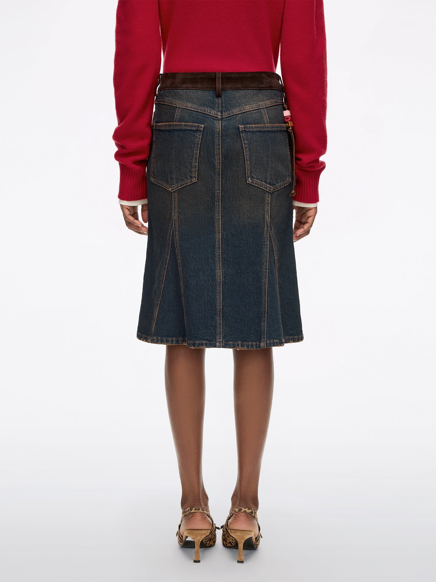 Trendy mid-length denim skirt featuring a mixed-material patchwork waist and exposed seam detailing on the hem for added texture. accented with charm embellishments. Crafted from cotton denim with a rugged. retro texture. it offers a comfortable. stretchy fit. Multiple washes enhance its retro denim character. giving each piece a unique look.