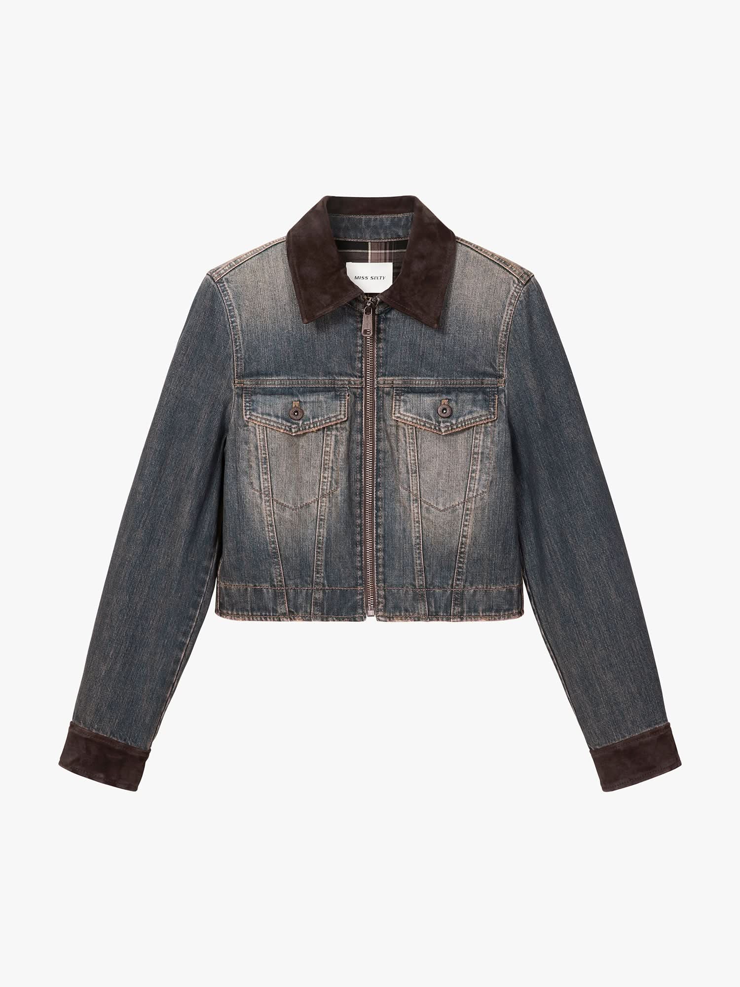 This denim jacket features a relaxed. cropped silhouette with a turn-down collar. accented with faux suede panels on the collar and cuffs for a retro. casual look. Made from 100% cotton denim with a rich slub texture. the fabric is soft yet maintains its structure. Multiple washes create a unique. naturally distressed appearance for each piece.