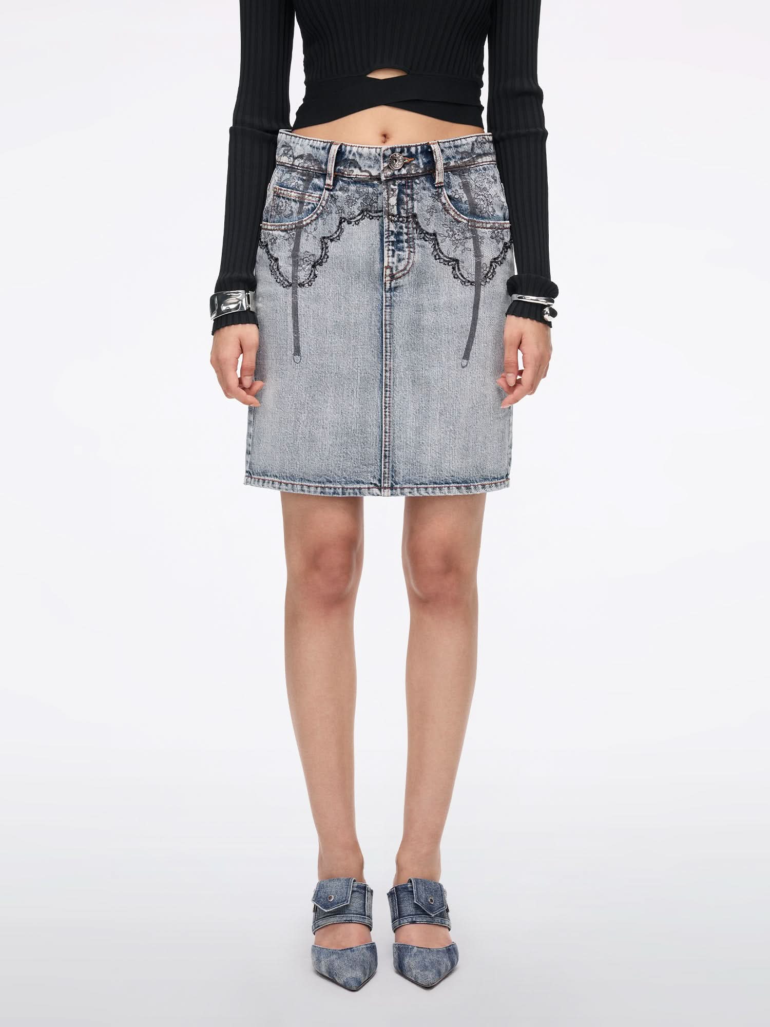 The denim skirt features a hand-painted lace print design. adorned with handmade crystal beads in various styles. creating a layered visual effect. Made from light blue pure cotton denim fabric and tailored with a fitted silhouette. it offers a soft and comfortable feel. while maintaining a structured and flattering shape.