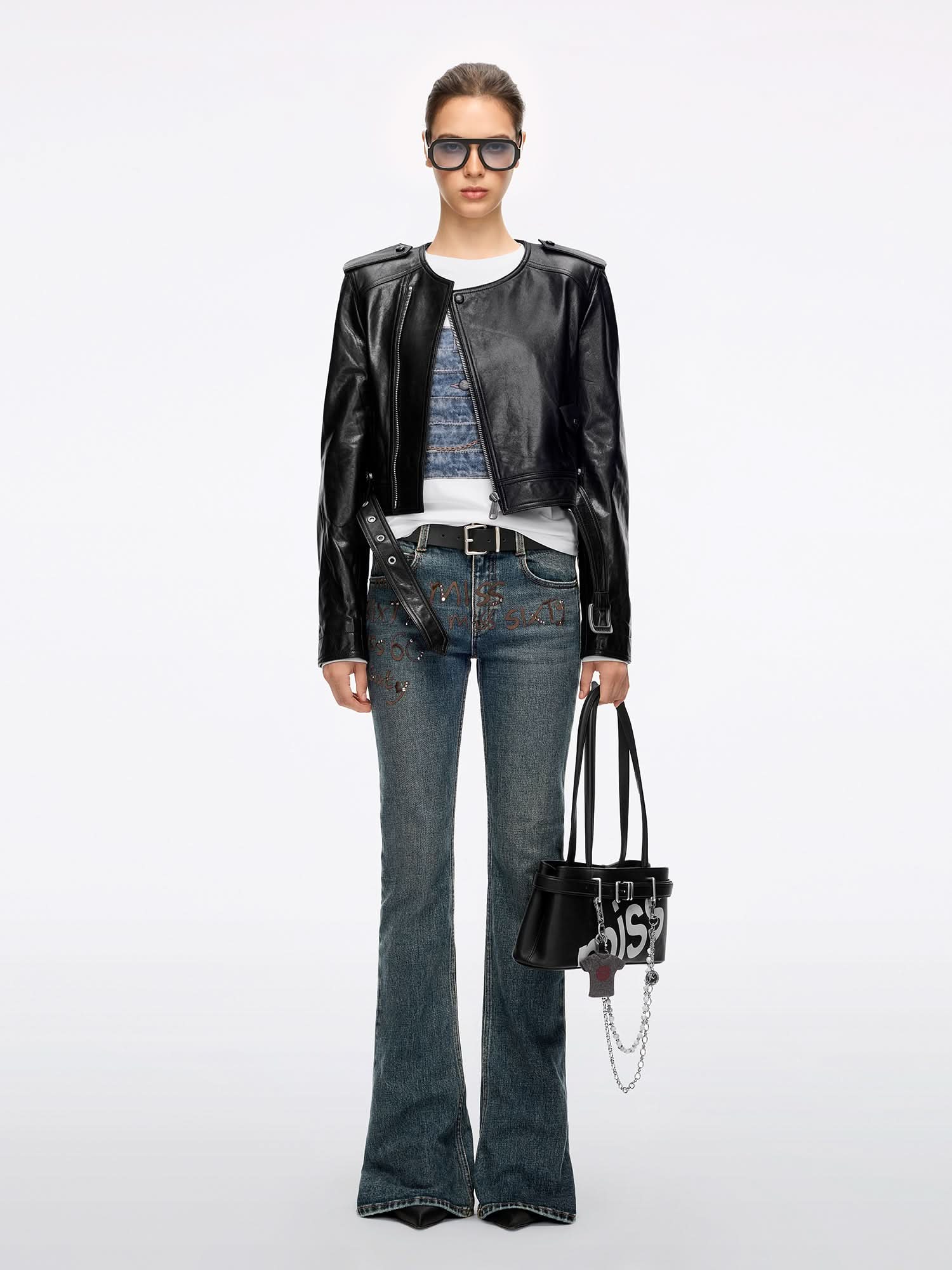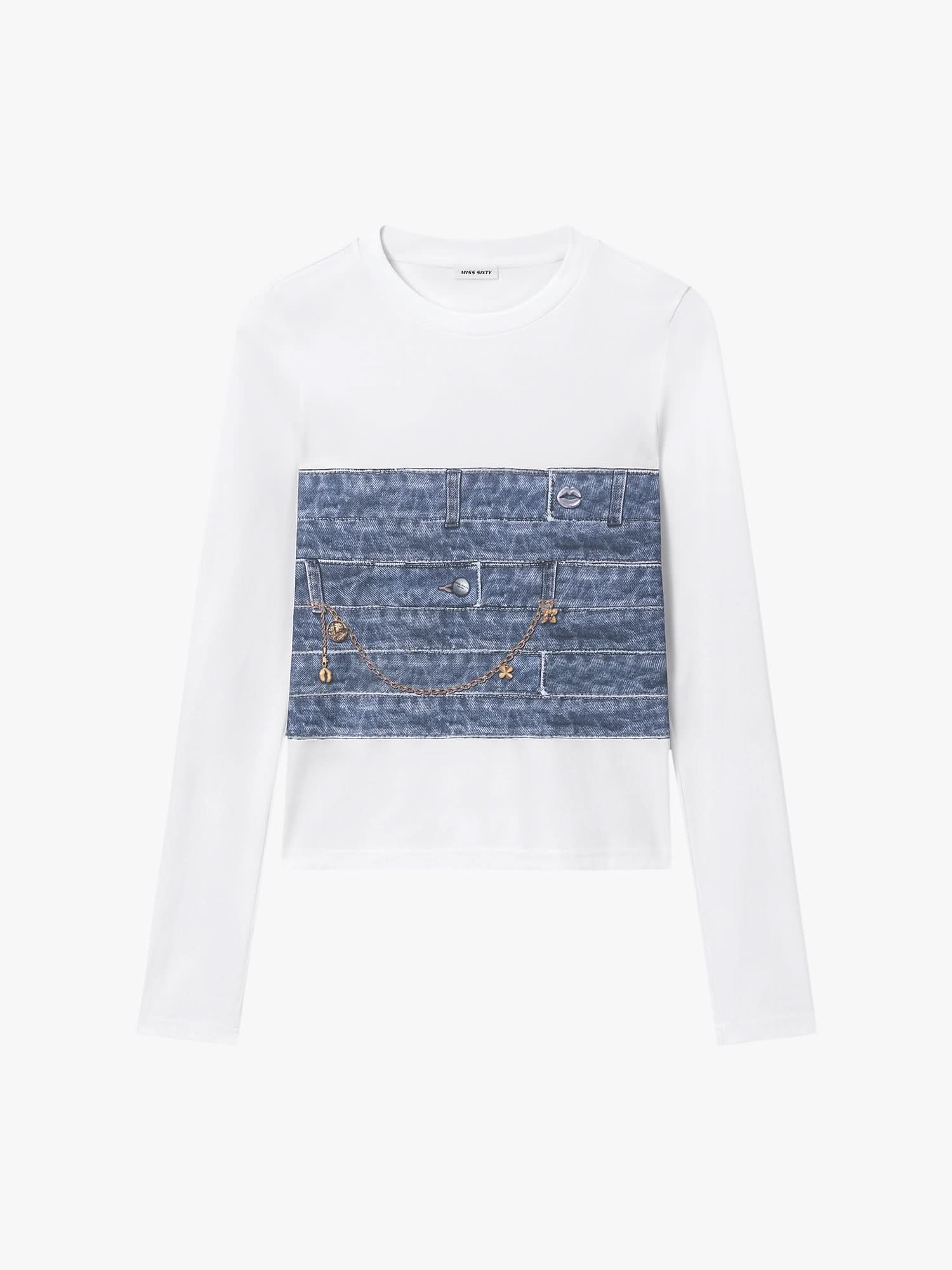 This long-sleeve T-shirt features a crew neck and digital print combining denim and vintage-inspired optical patterns for a vibrant. eye-catching layered look. Made from a blend of long-staple cotton and spandex. the elastic ribbed fabric fits the body comfortably while feeling soft. smooth. and unrestricted.