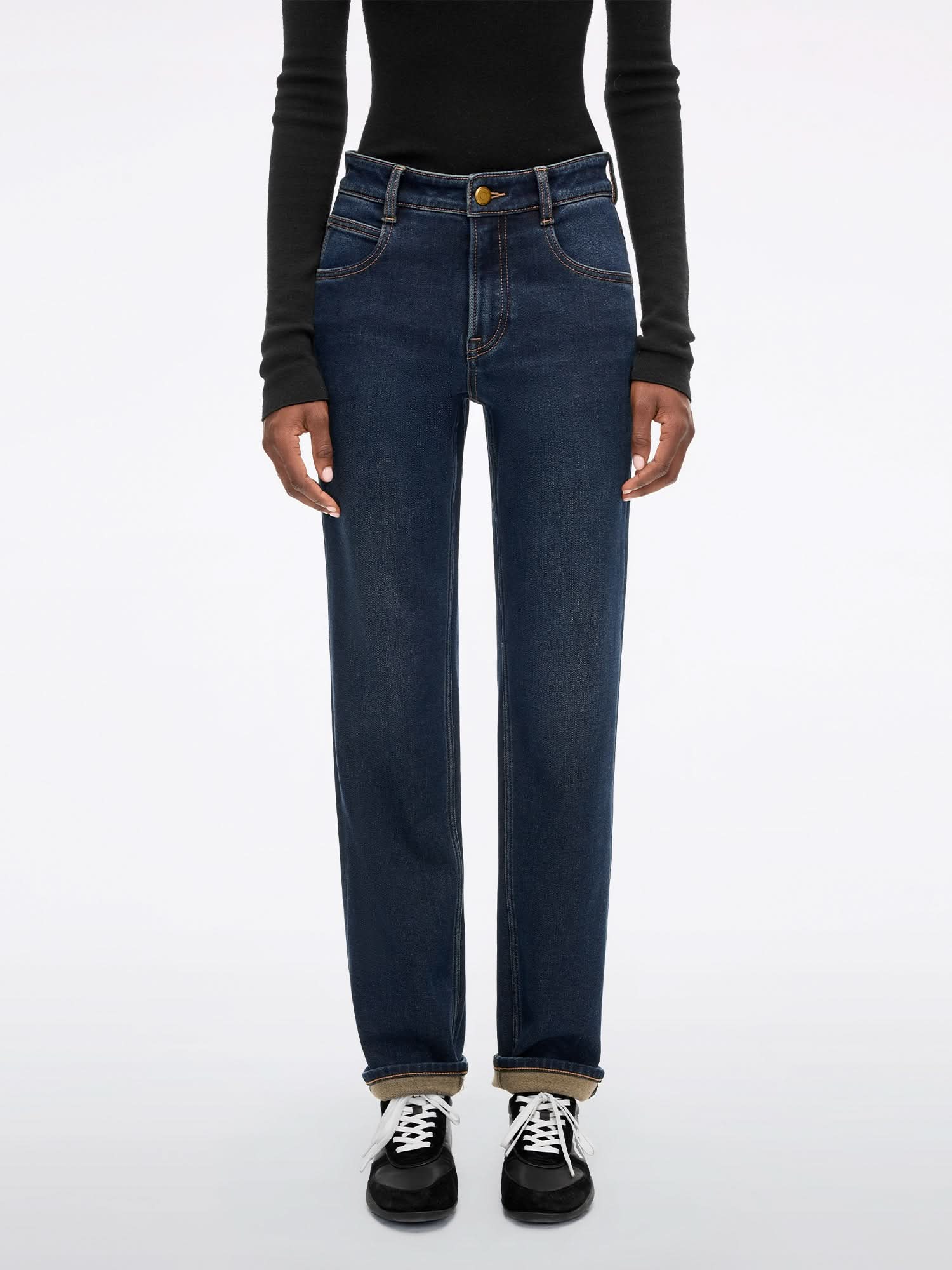 EVERYDAY-SSM Skinny Jeans feature a mid-rise design with a tapered fit that comfortably hugs the legs. The contoured yoke enhances the shape of the hips. highlighting natural curves. Made from high-stretch alpaca-blend denim in a vintage dark wash. these jeans have a soft. brushed inner layer for warmth and comfort.
