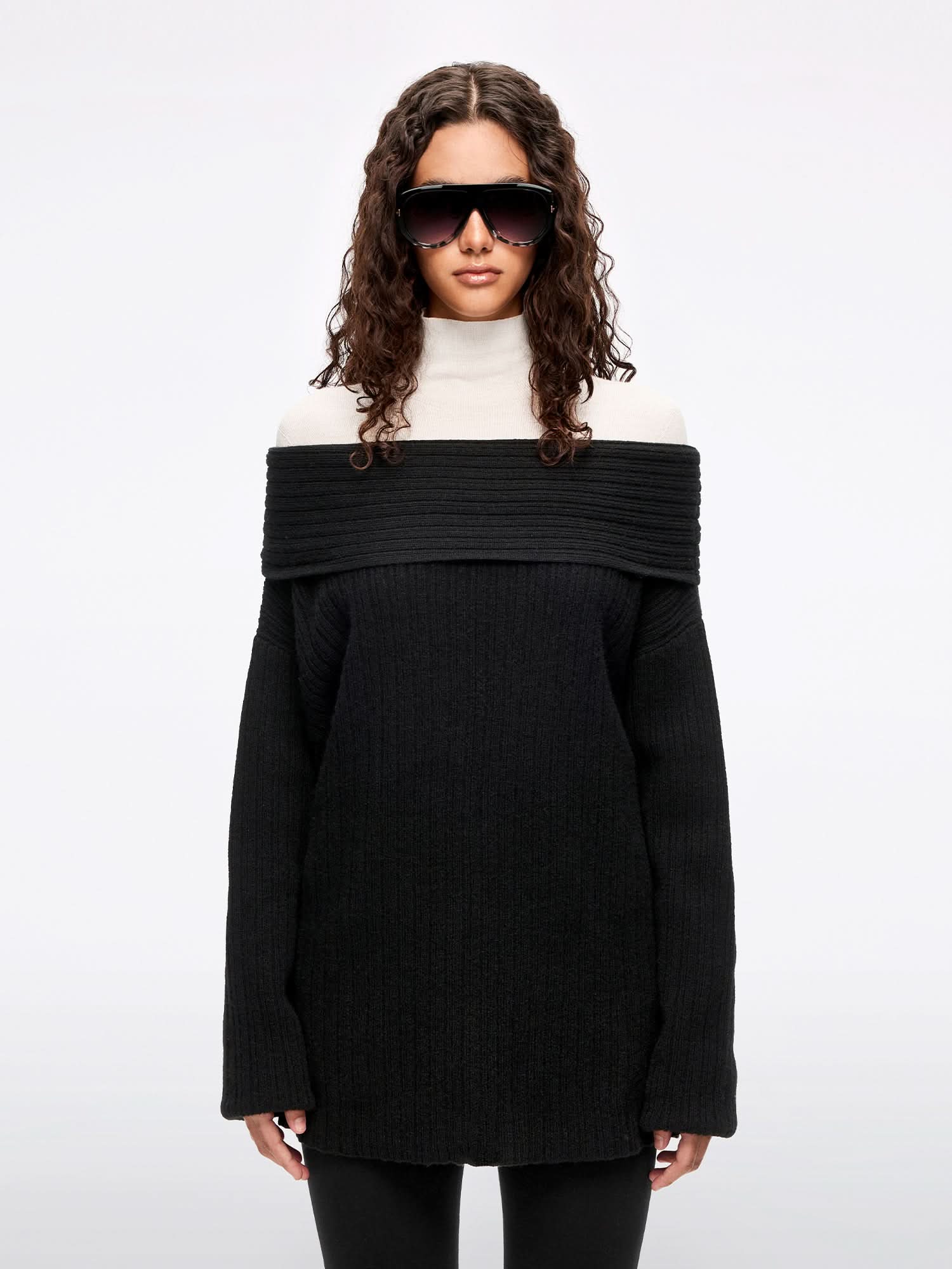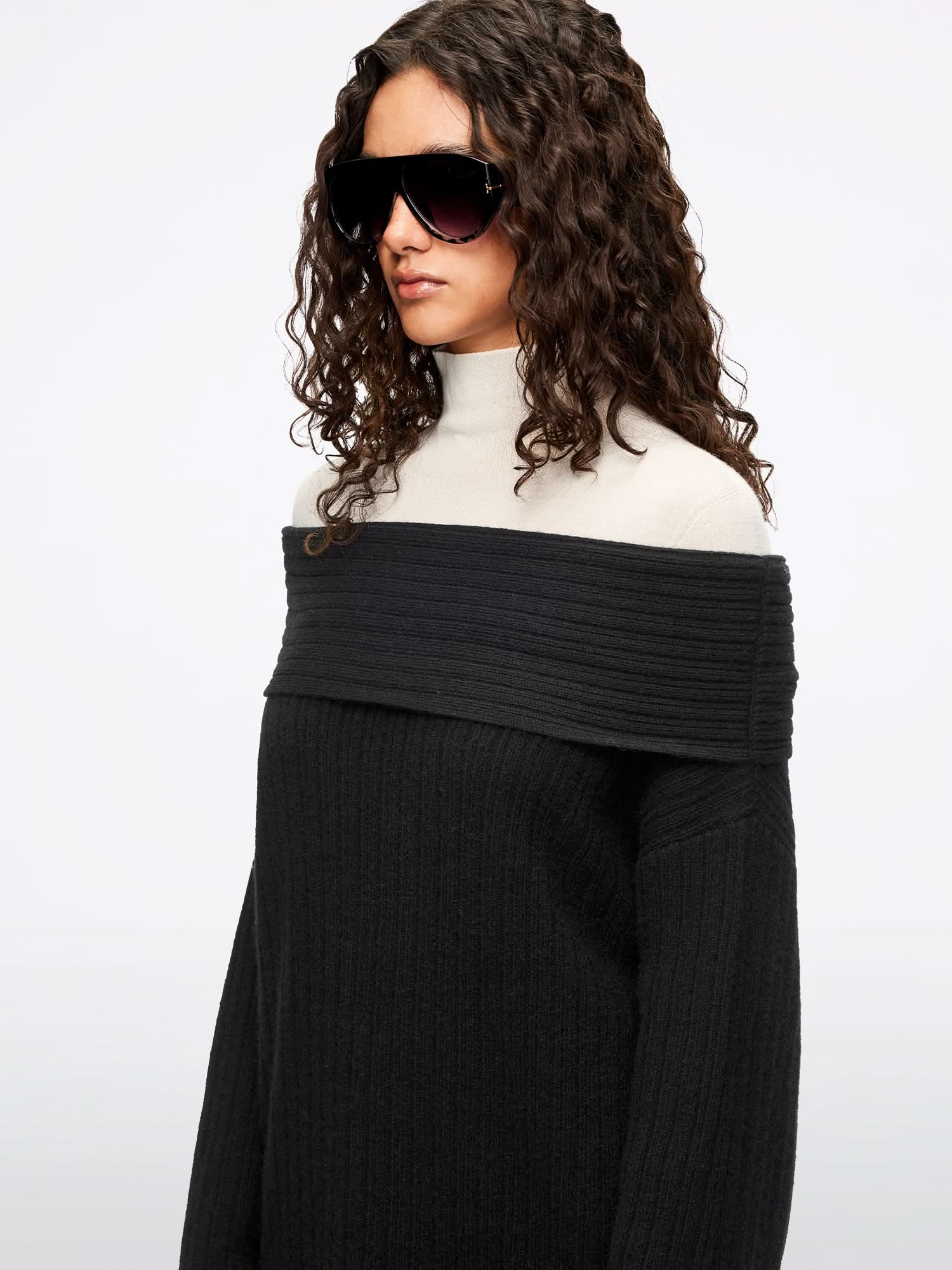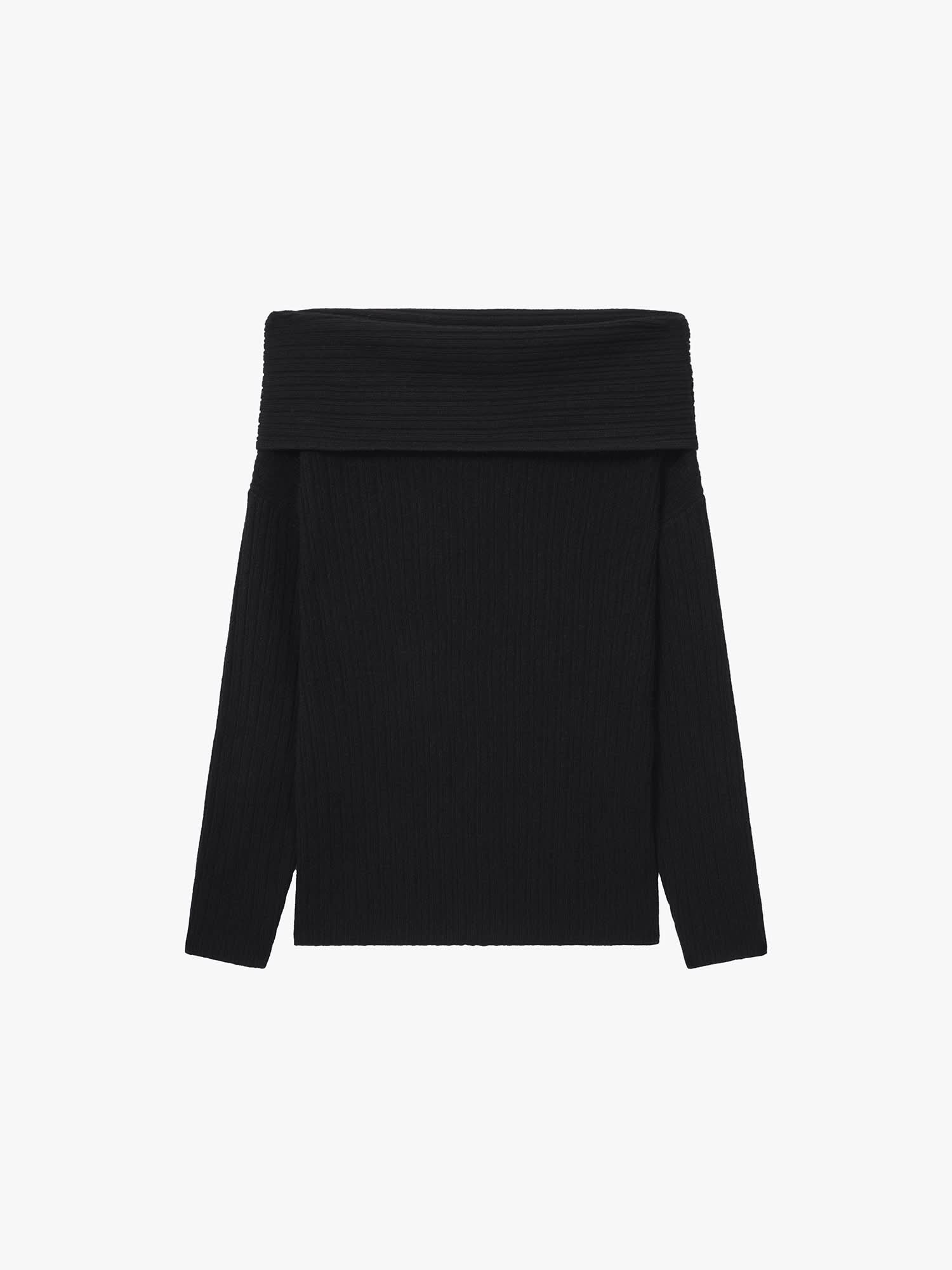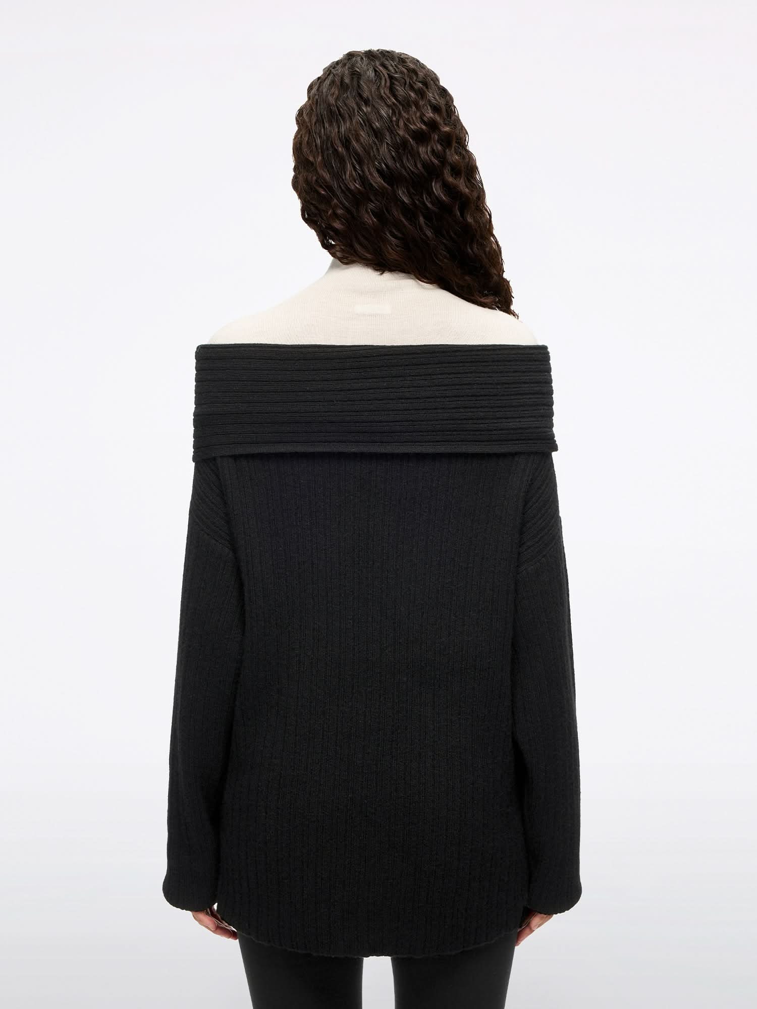 This knit top features an off-shoulder design with a richly textured ribbed pattern. highlighting its knitted craftsmanship. Made from yak wool. it is soft to the touch with fine. resilient fibers. offering a smooth and plush feel. Lightweight and comfortable. it effortlessly delivers a warm. cozy look for autumn and winter.